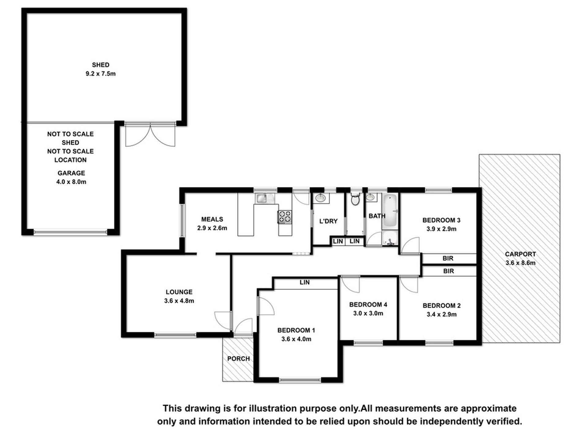 The brick 4x8m garage leads to the 9.2x7.5m shed, plenty of room for storage, workshop and extra vehicles. There is also a 3.6x8.6m carport running the length of the other side of the home with a small work area and a verandah allowing you to get inside under cover.