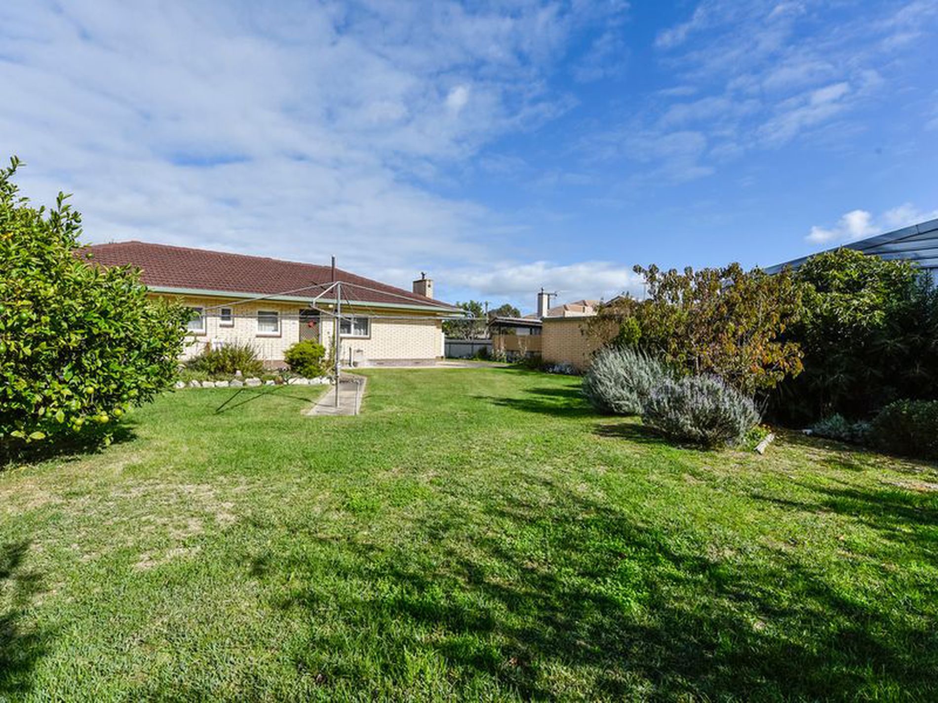 The large rear yard is private with established garden beds,