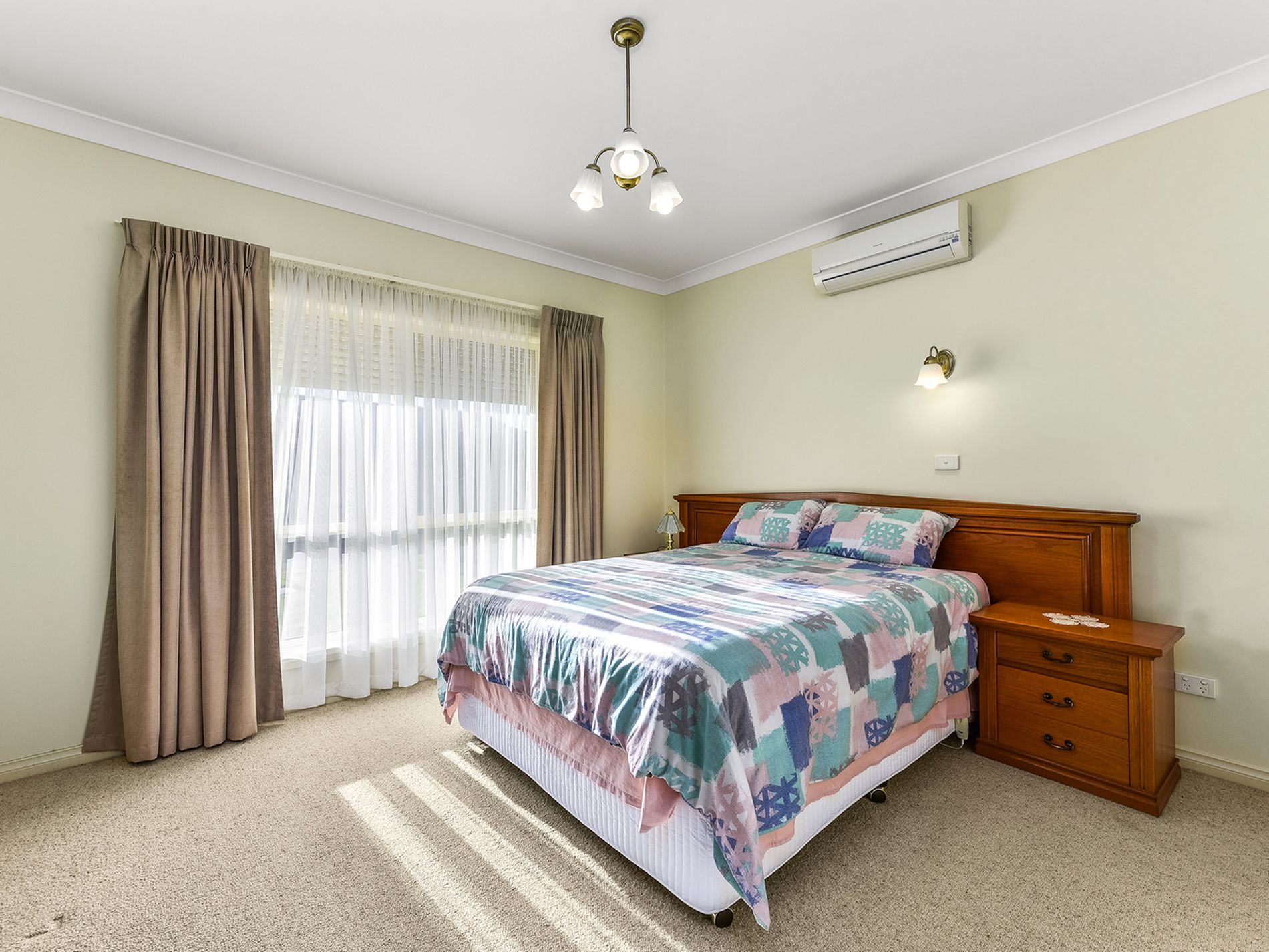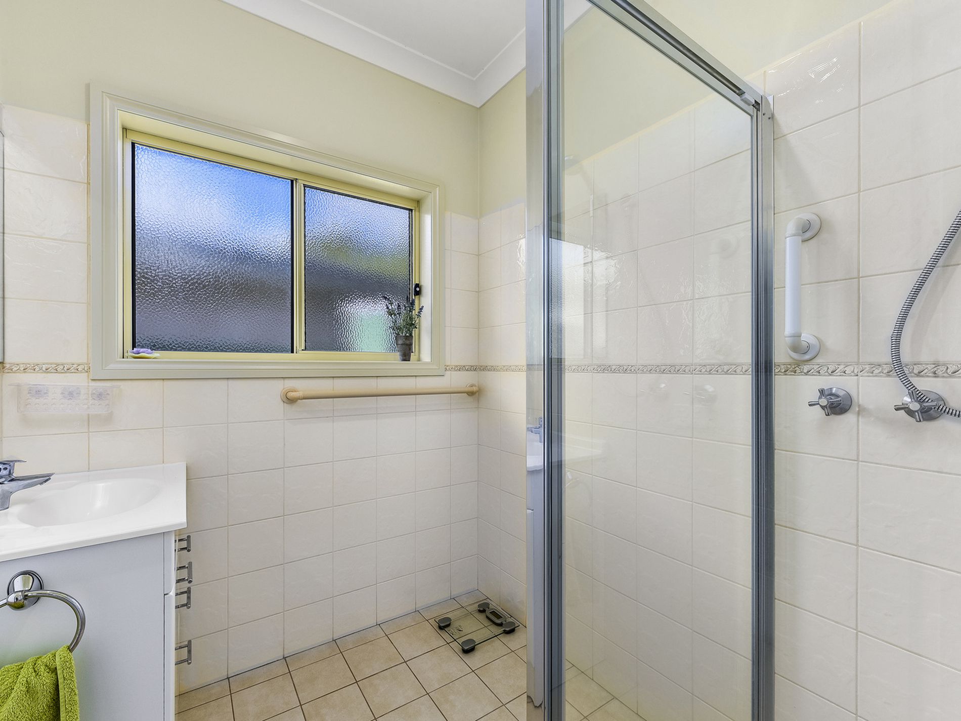 Main bedroom is carpeted with external roller blind, built in wardrobes and reverse cycle air conditioner unit. 2nd bedroom is also carpeted and has built in wardrobes. Bathroom is right next to bedrooms with shower and vanity and separate toilet. Linen press in hallway.