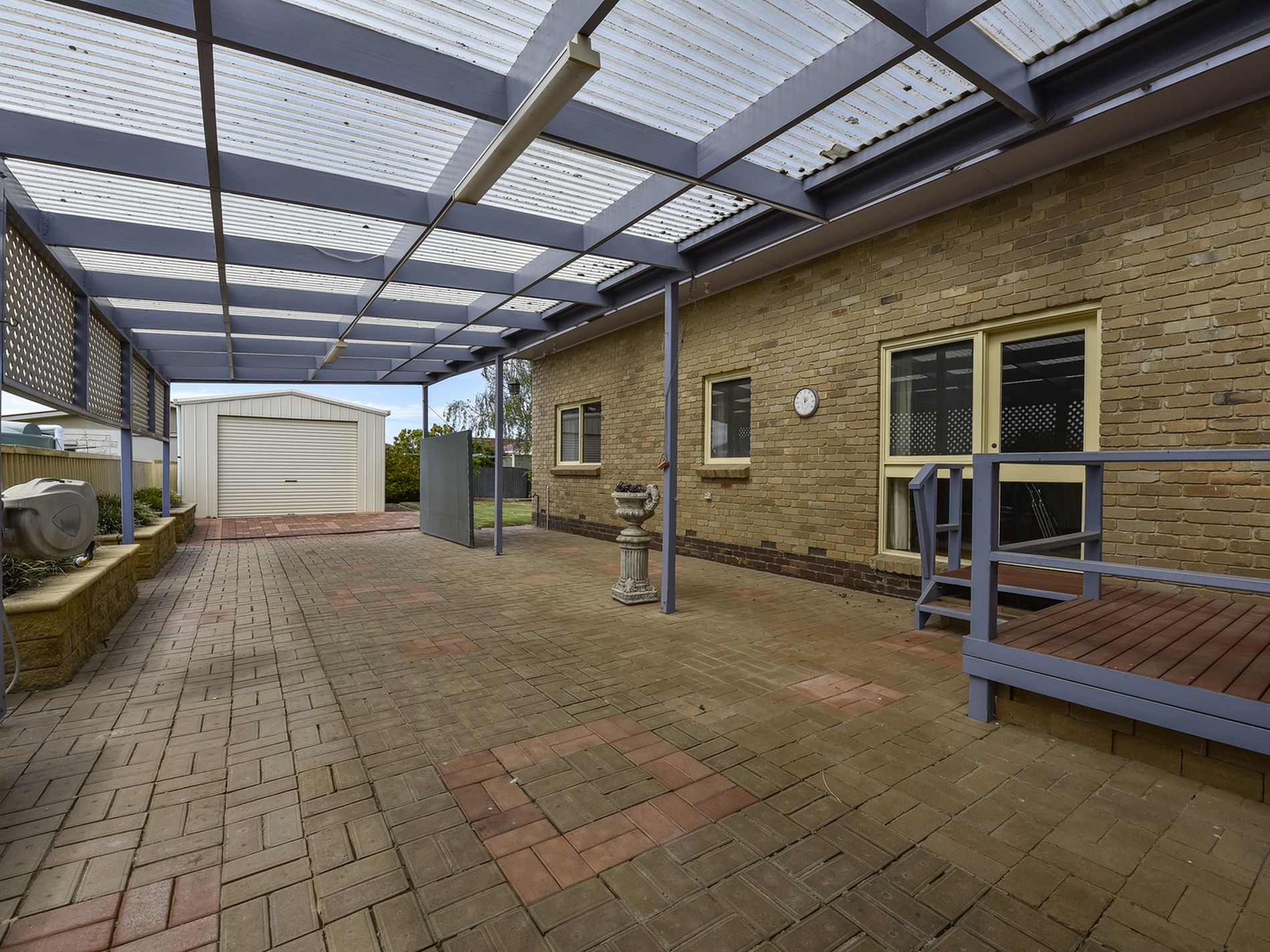 Outside there is a small deck off the lounge and a huge paved pergola behind the drive through garage with automatic roller door. A large 4 bay colourbond shed is at the rear of the block it has cement floor and power and has previously housed a caravan. There is also a garden shed. A pump and bore provide water to the yard which has automatic sprinklers front and back. The house is on town water and sewer except for the toilet which is rainwater. The property also has a 5KW solar system.