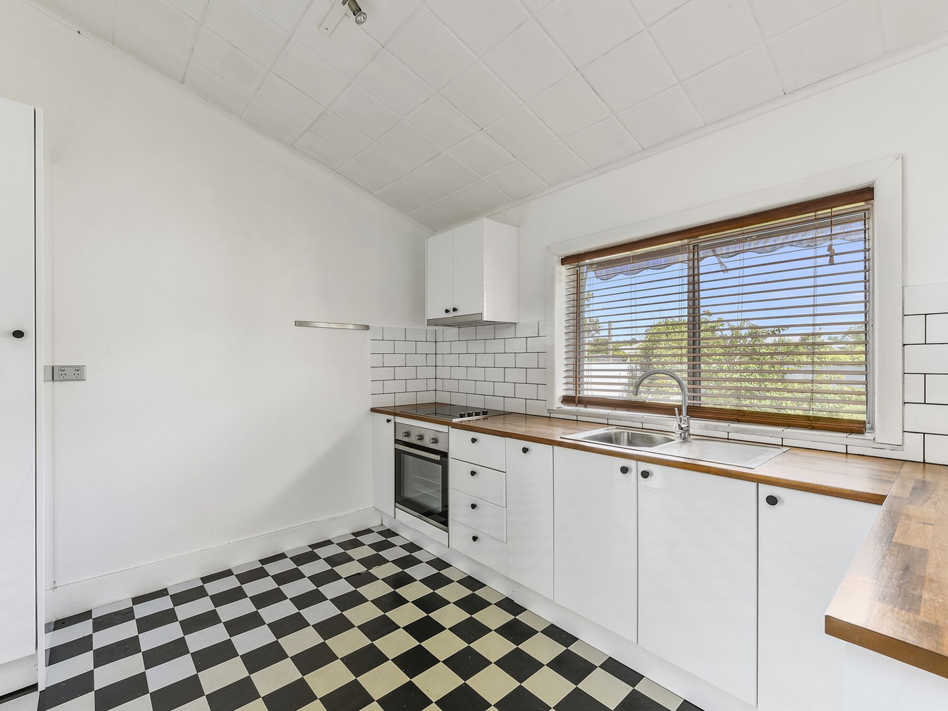 Renovated Kitchen with black/white lino with electric under bench oven.