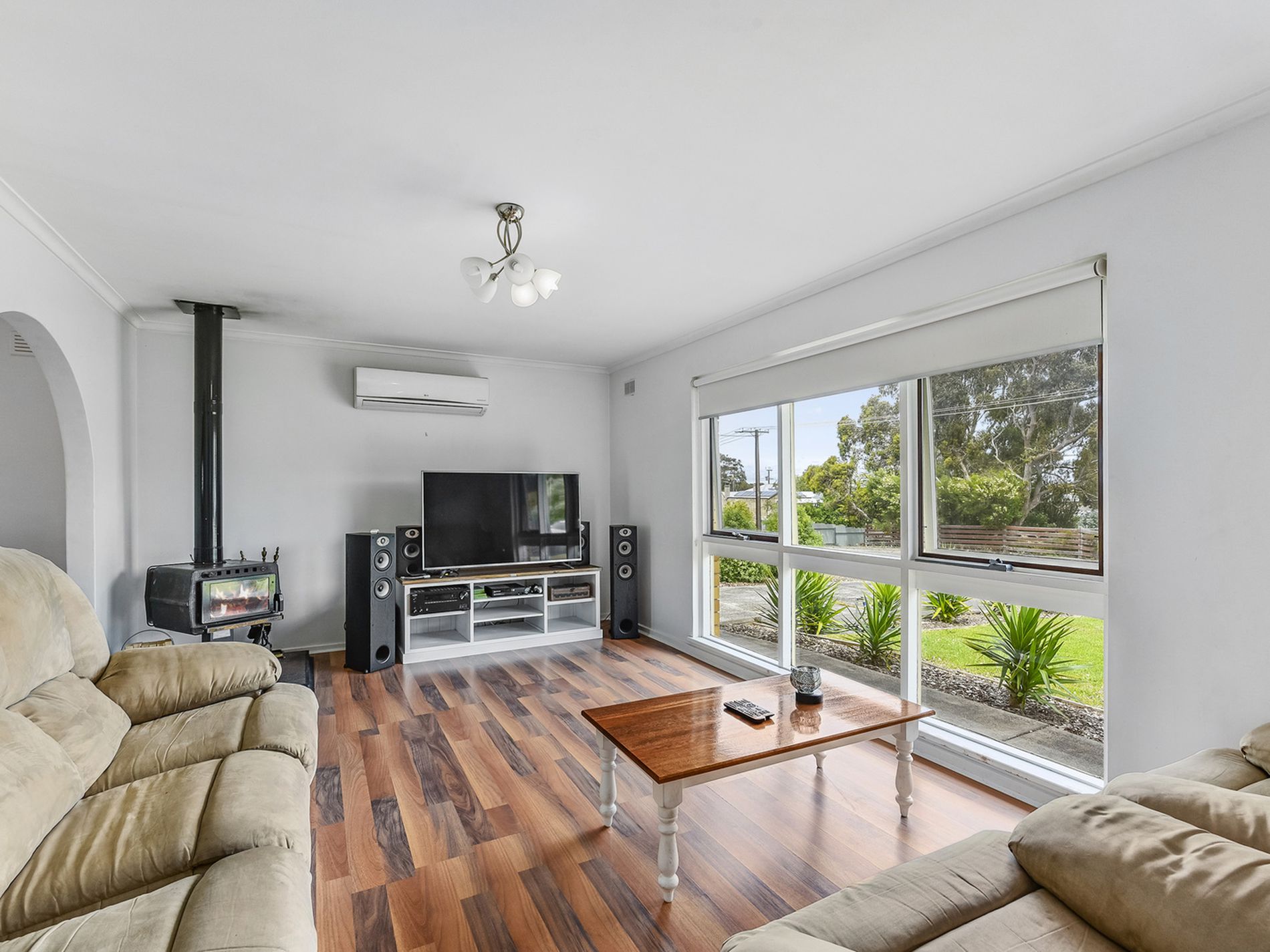 The kitchen is stunning with heaps of cupboards, electric cooking, Range hood, dishwasher and pantry. It is open to the dining area which has a door leading out to the pergola. This space has timber look laminate flooring which also flows through the living, entry and passage. The lounge is light and bright and a reverse cycle air conditioner and slow combustion wood fire heat and cool the home from here.