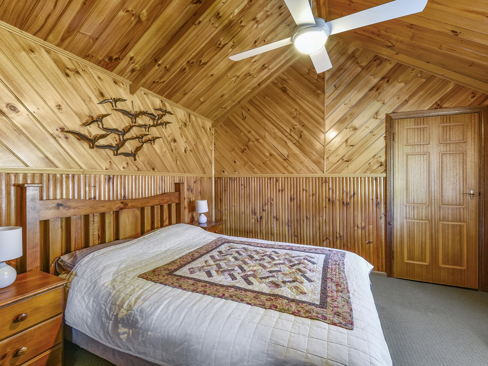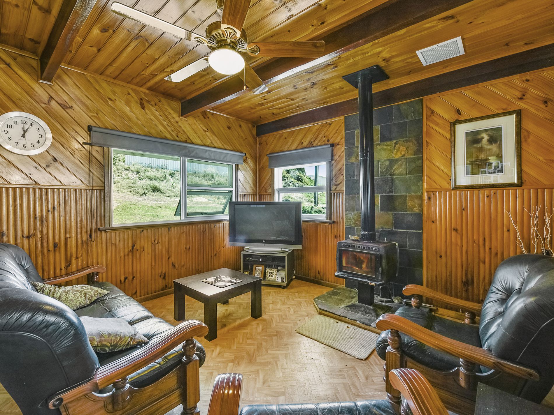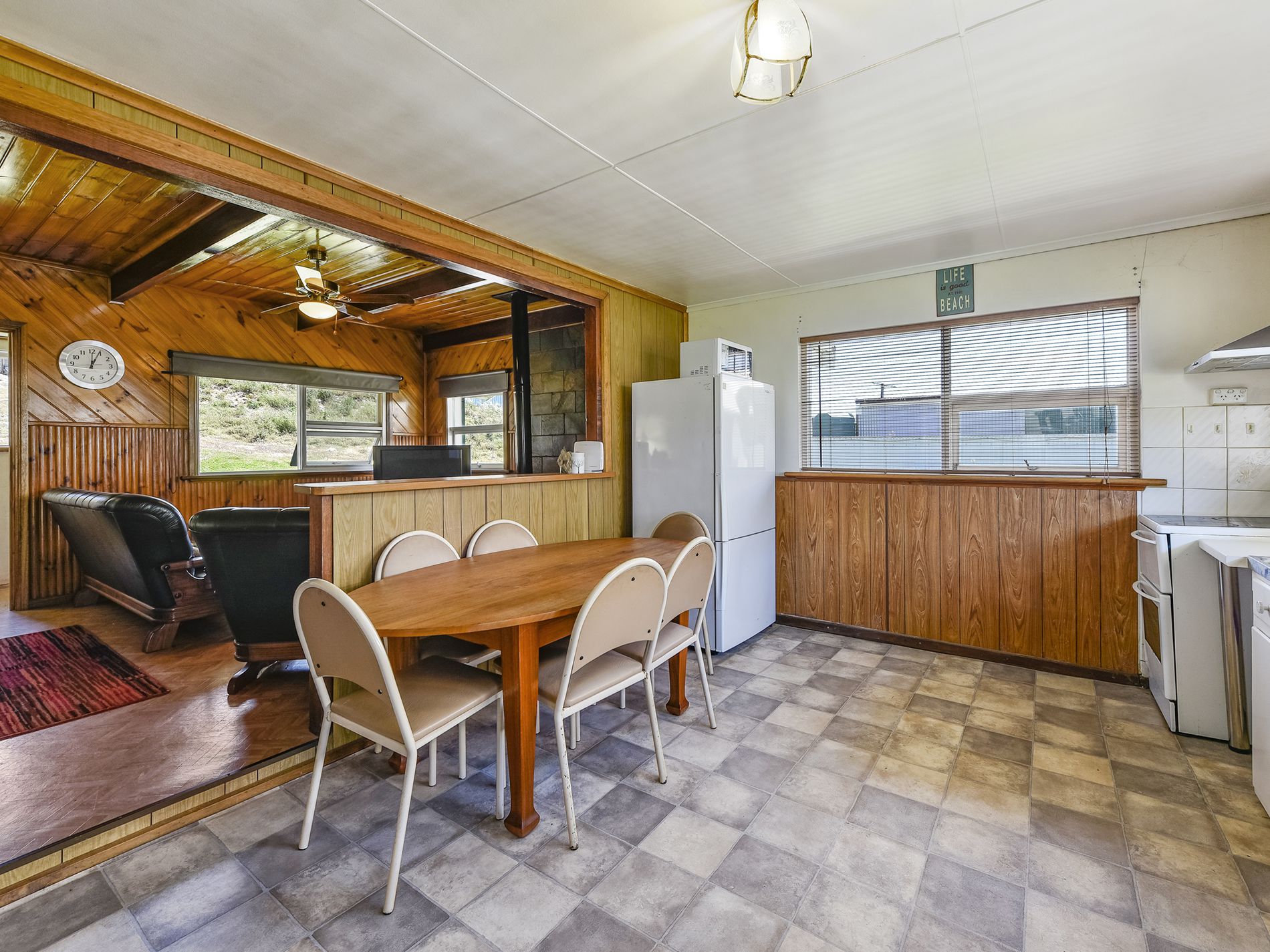 Large lounge with timber lined panelling, slow combustion heater, ceiling fan and open to kitchen. Electric stove and rangehood.