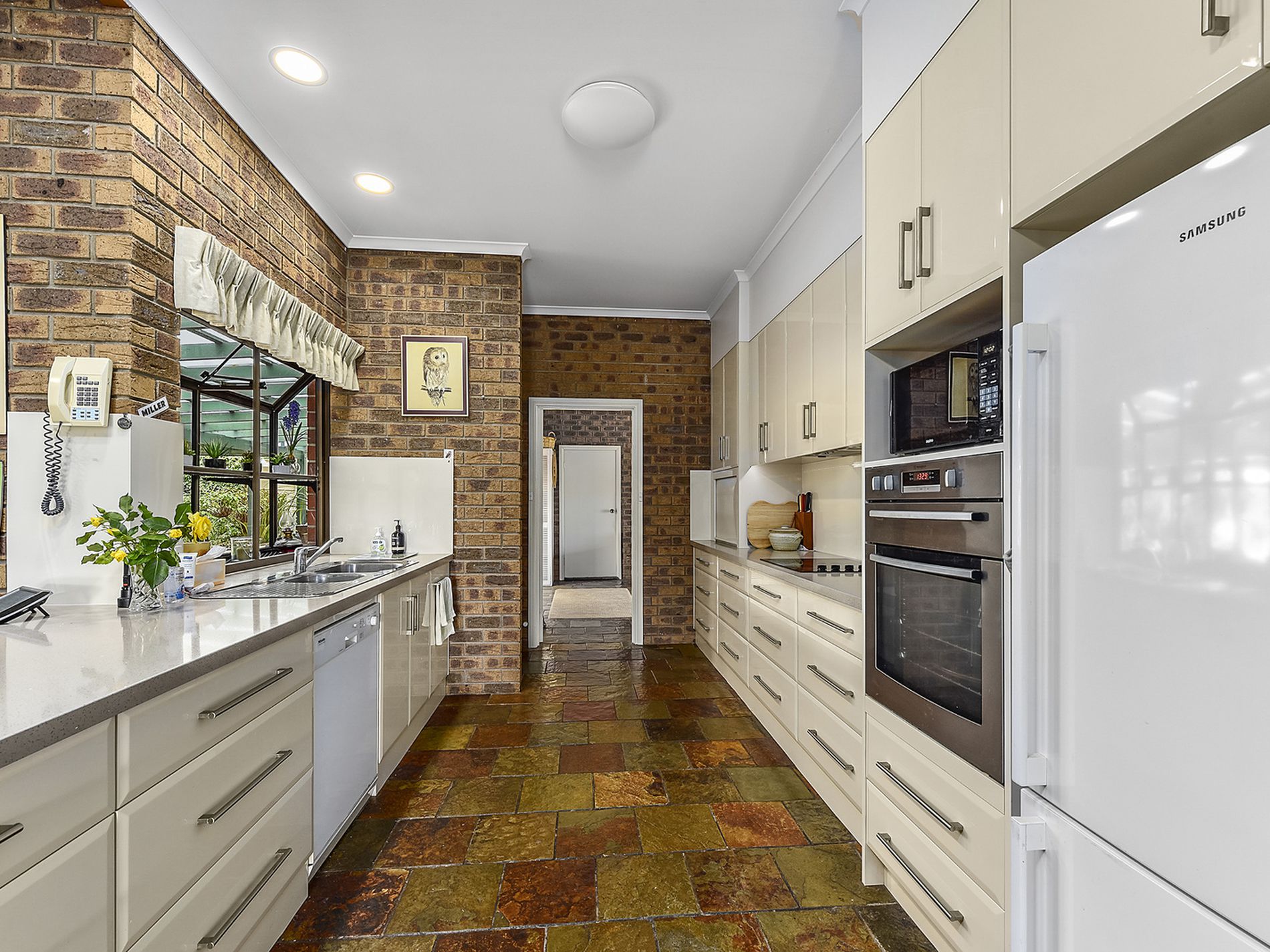 Fresh decor throughout kitchen and lovely garden outlook with separate dining area.