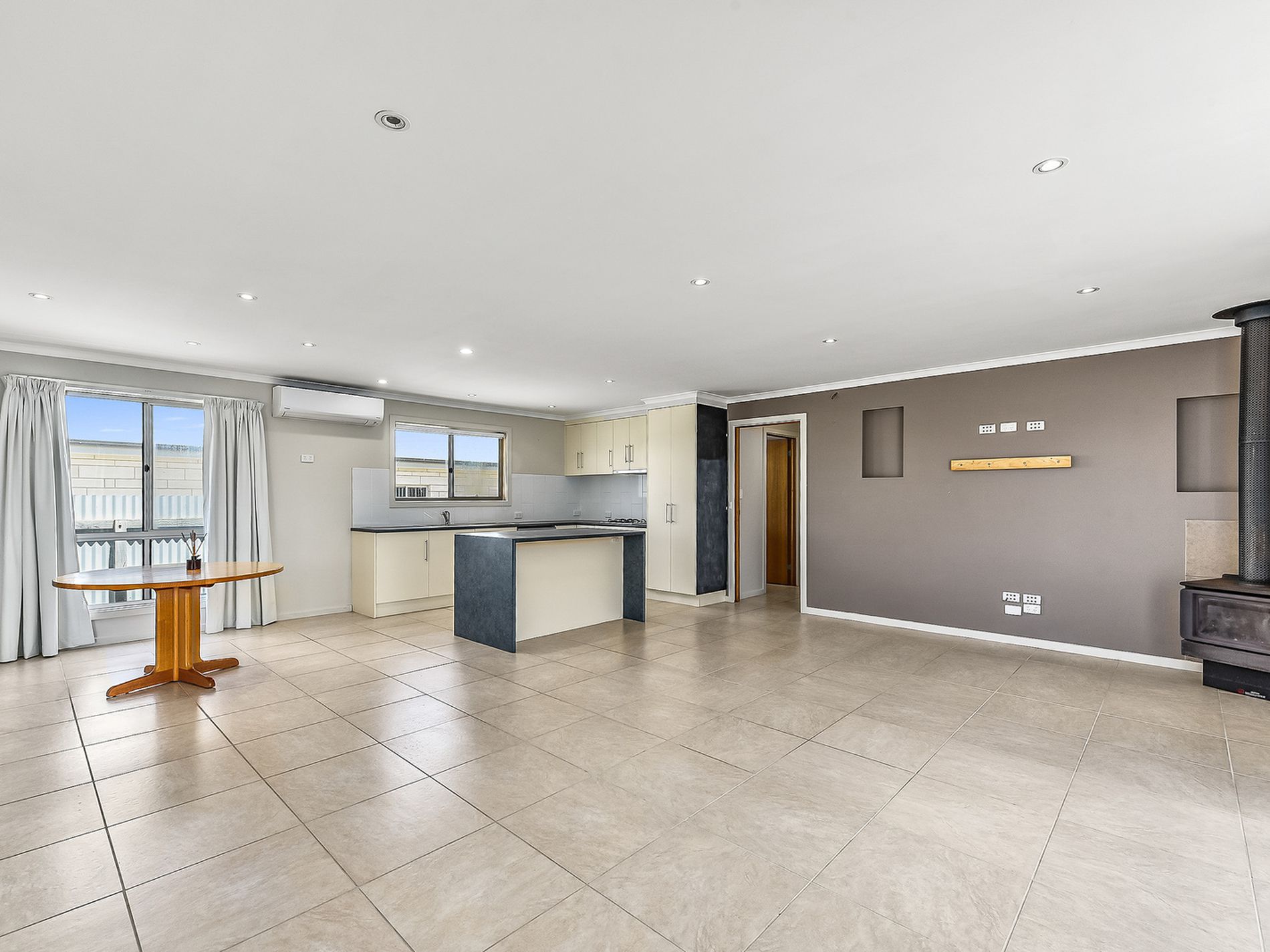 Split System air conditioner and corner Slow combustion fire and a place for that massive TV.
