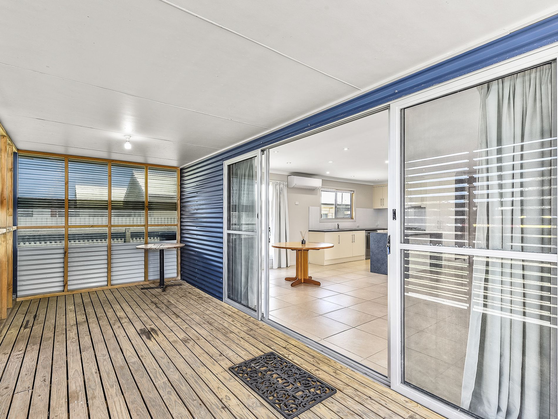 Front privacy timber screens along the porch and sliding door opening into the kitchen, dining and lounge.