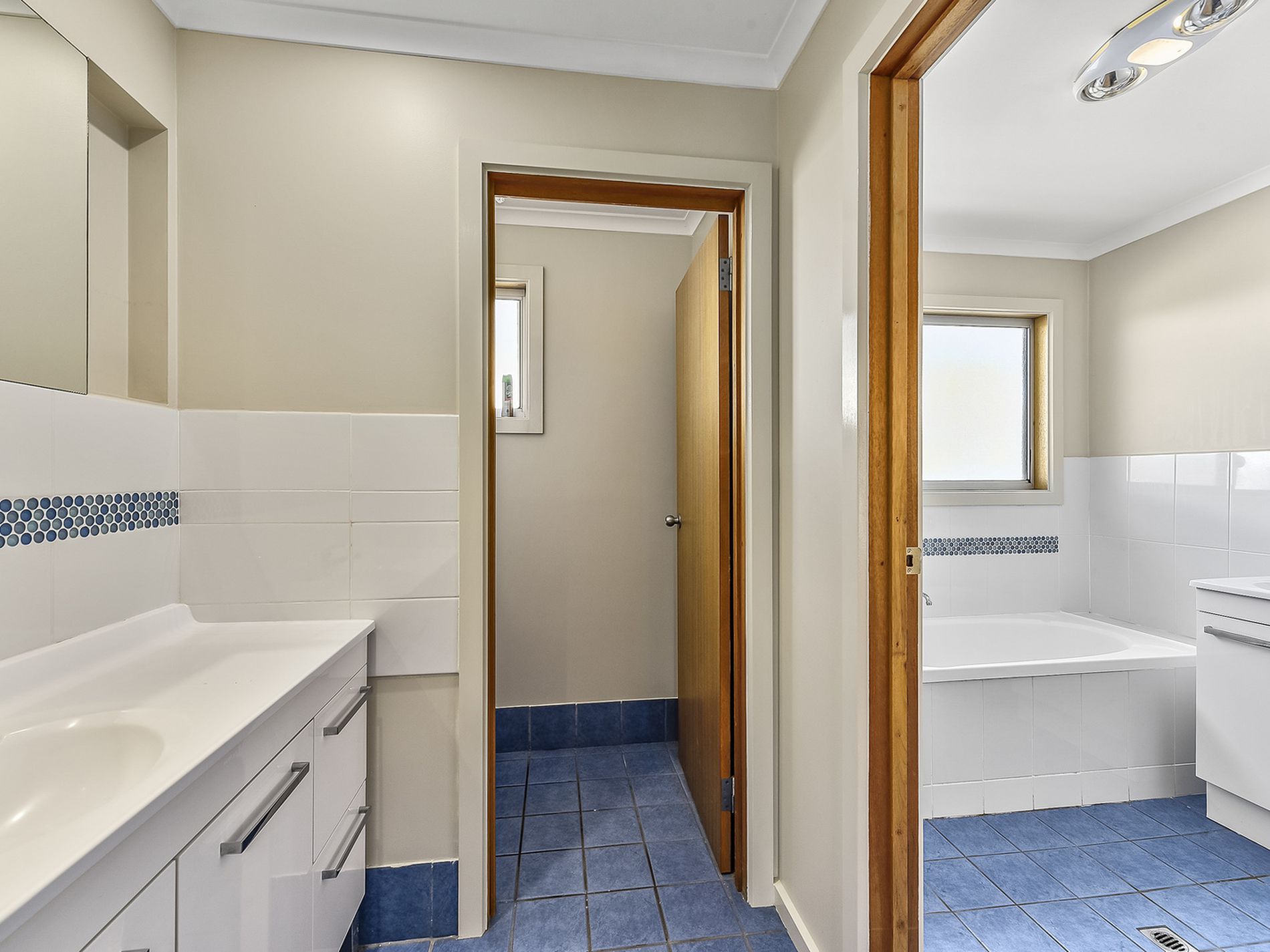 Practical 3 way bathroom suiting the busy family with 2nd toilet and 2 vanities.