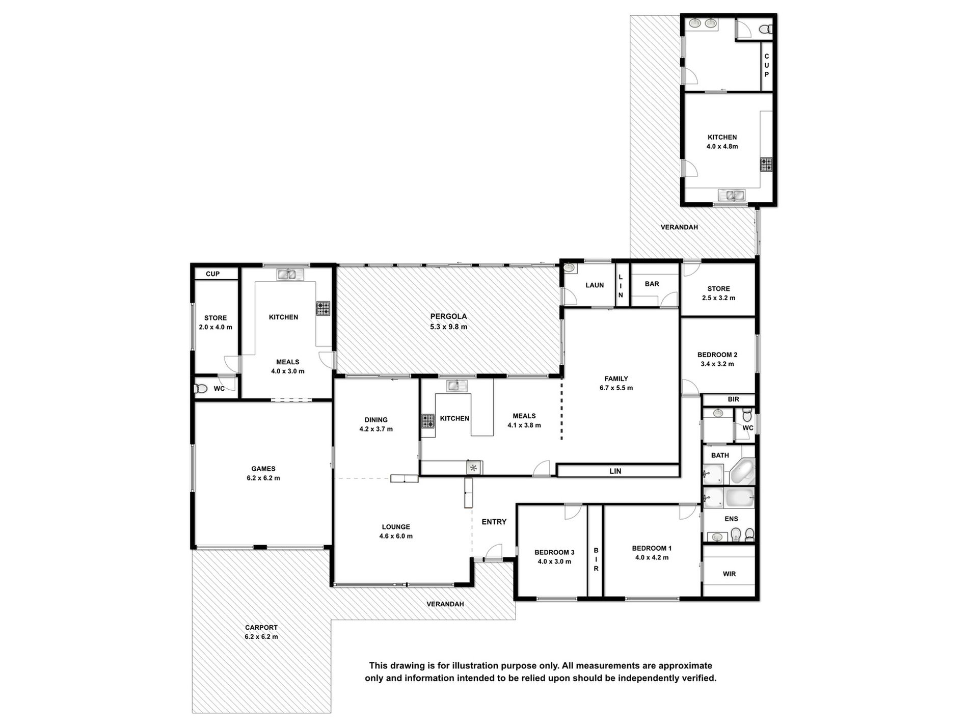Sliding door leads out to fully enclosed pergola that gives year-round use. Also undercover is access to a self-contained granny flat or retreat which has a fully outfitted kitchen and bathroom. Neat and tidy front and rear yard with small rainwater tank, bore and mains water supply.