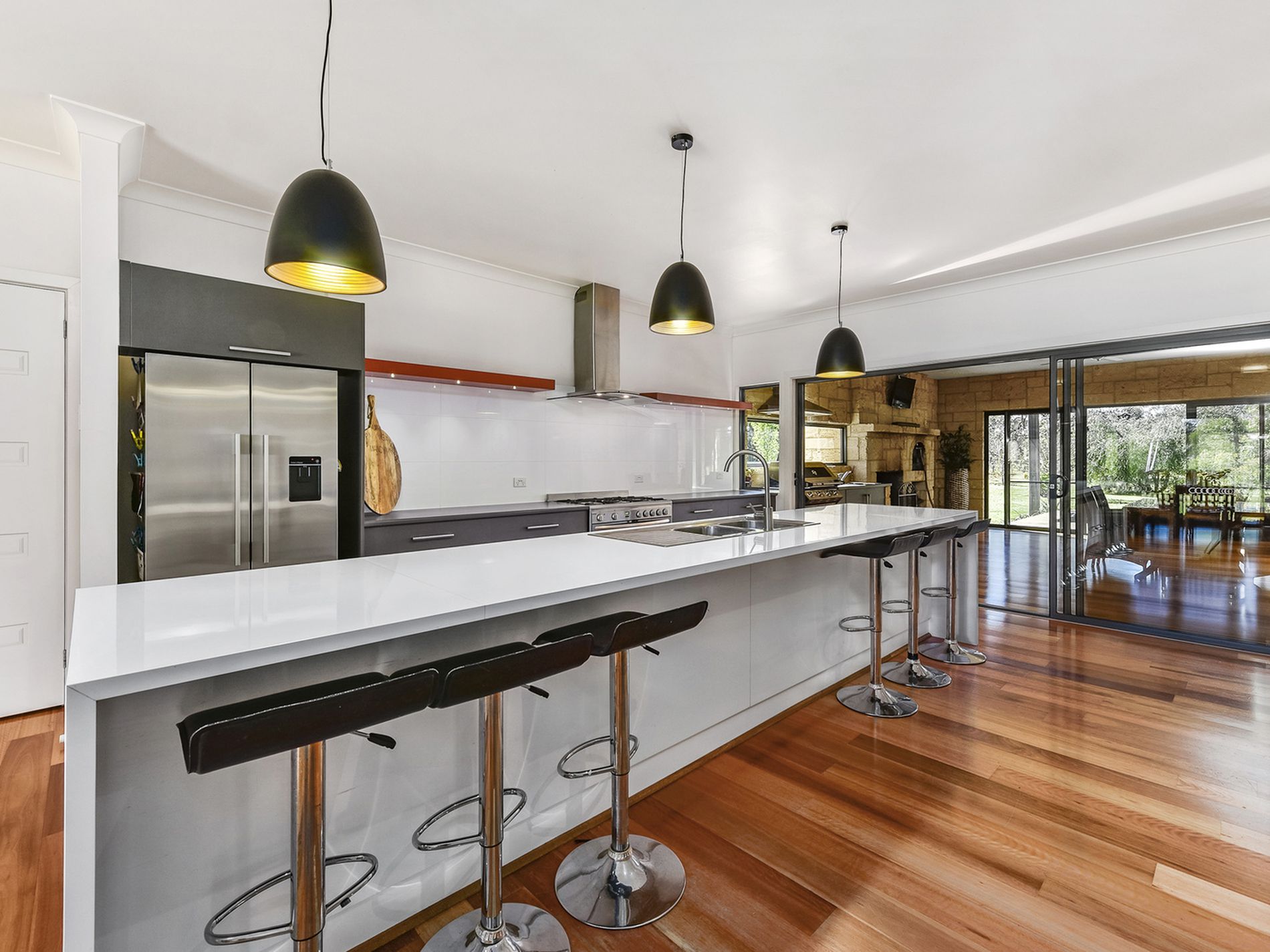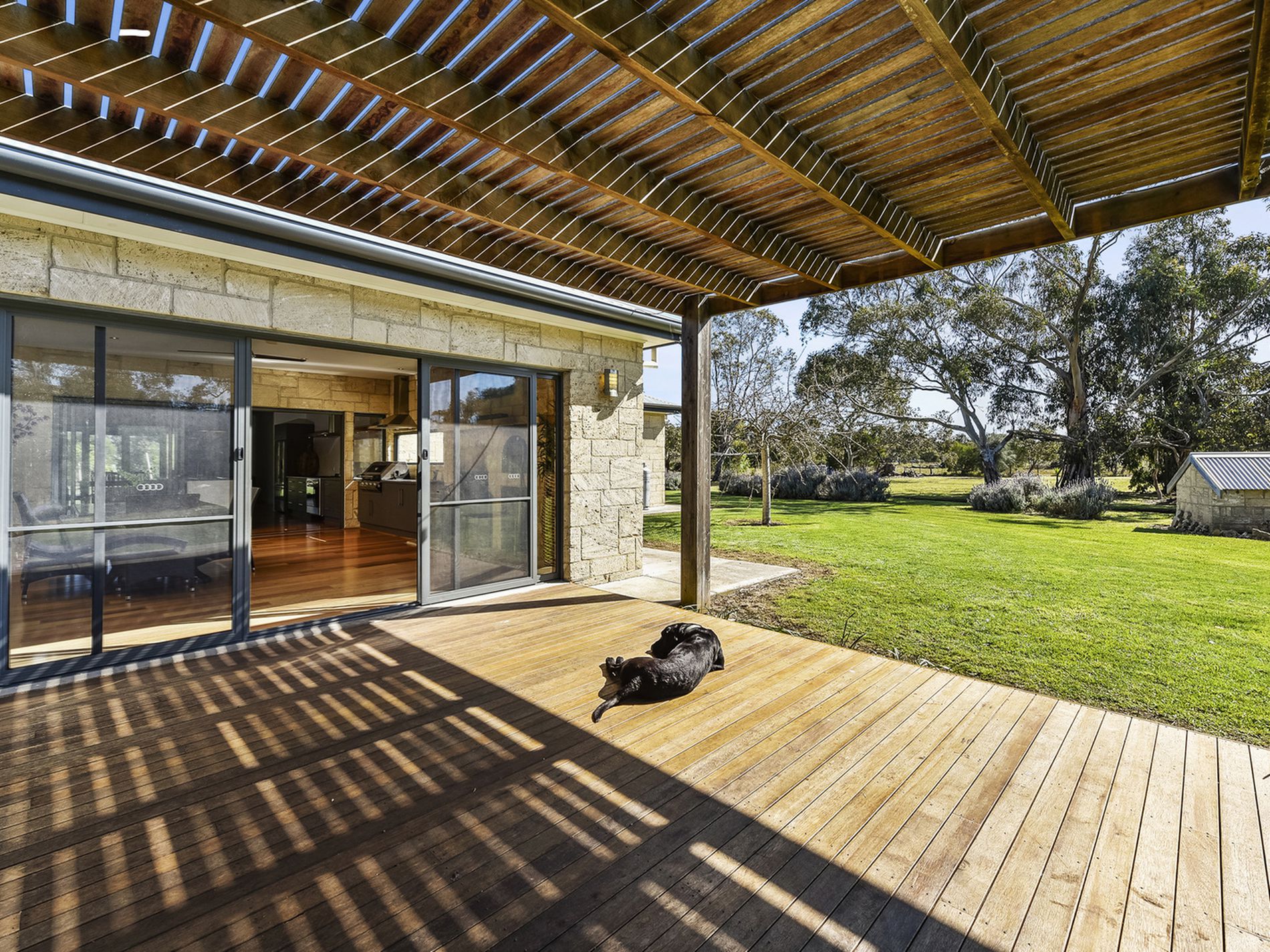 Entertainers with drawl opening the large stacker doors into the exposed WA limestone indoor/outdoor alfresco room which makes for year-round entertaining. Built-in BBQ, Woodfire pizza oven, cozy open wood fire, fan, and extra toilet right there close and handy. Further opens to the decked pergola area.
