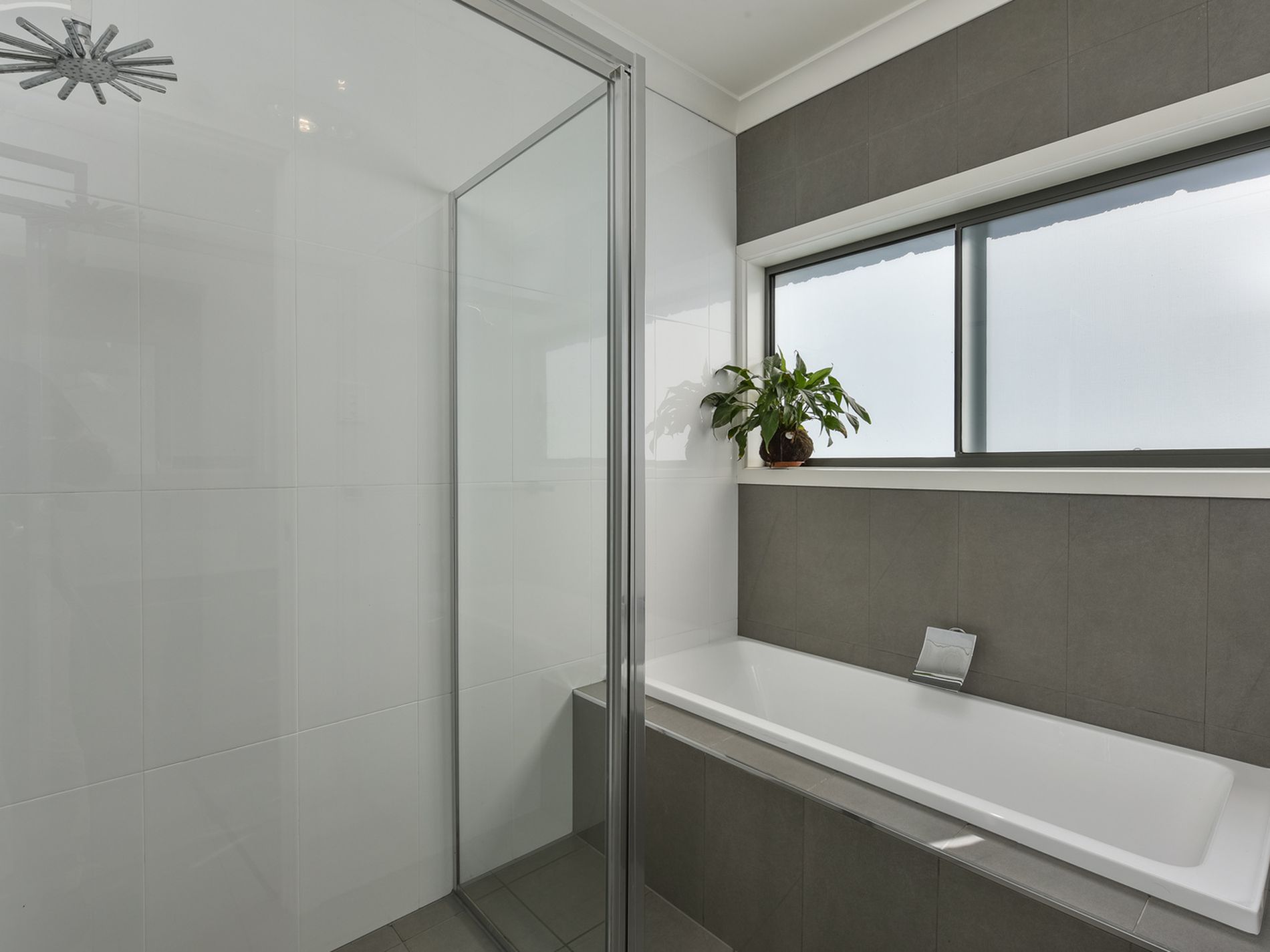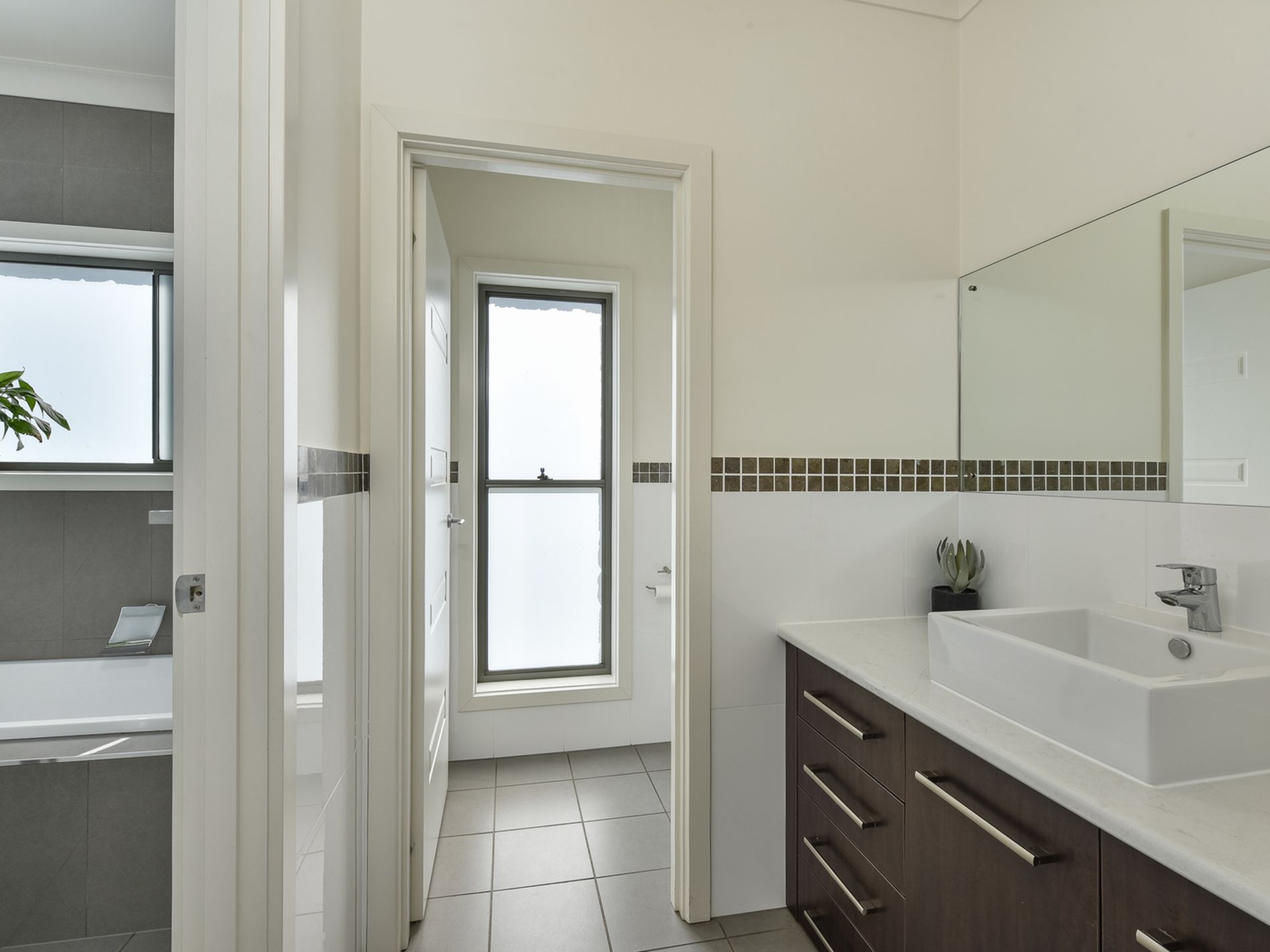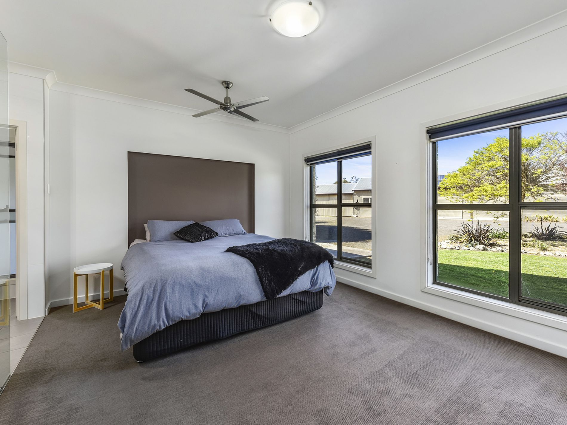 The Master bedroom is on the right with an open exposed ensuite shower and vanity, Walk-in robe, and separate toilet door.