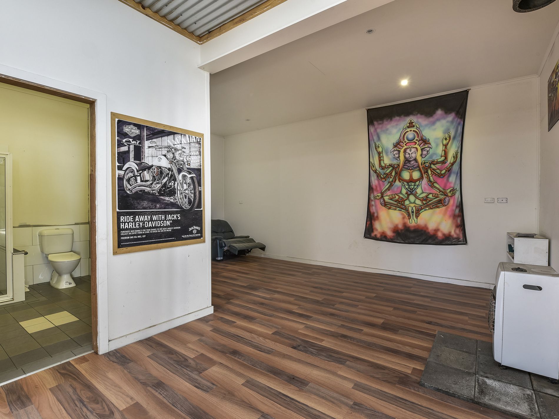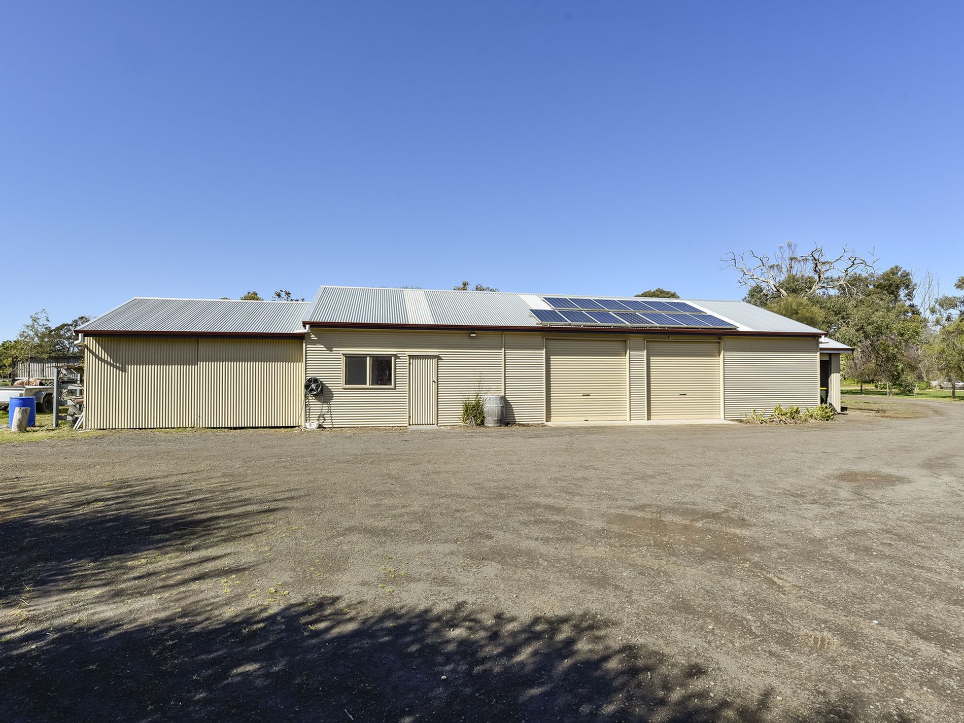 A 5 bay colorbond shed with extension can house 4 vehicles, plus an open mower shed. Internal fit-out of a workshop and granny flat or retreat has multiple uses which is like a studio, including a bathroom of shower, toilet, and living room.