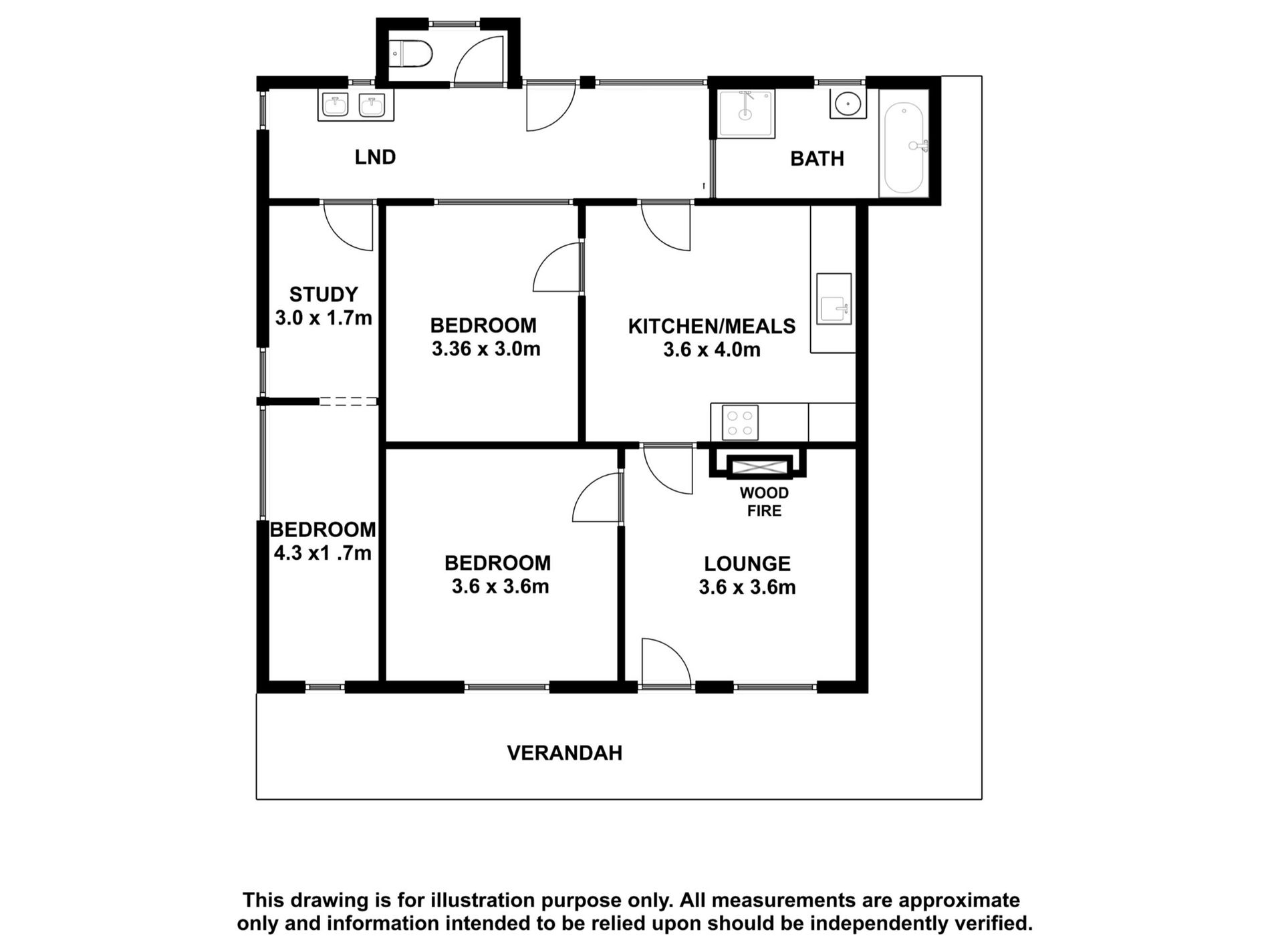 3 bedrooms and a bathroom with a separate bath and shower. The toilet is off the laundry and rear door.