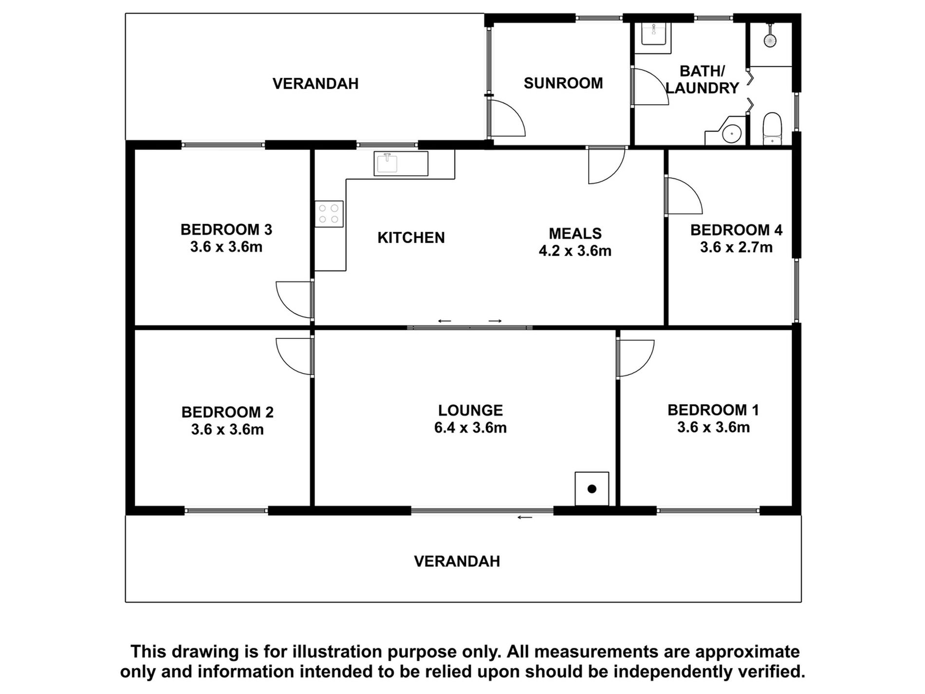 Simple layout of central lounge and kitchen with 4 bedrooms