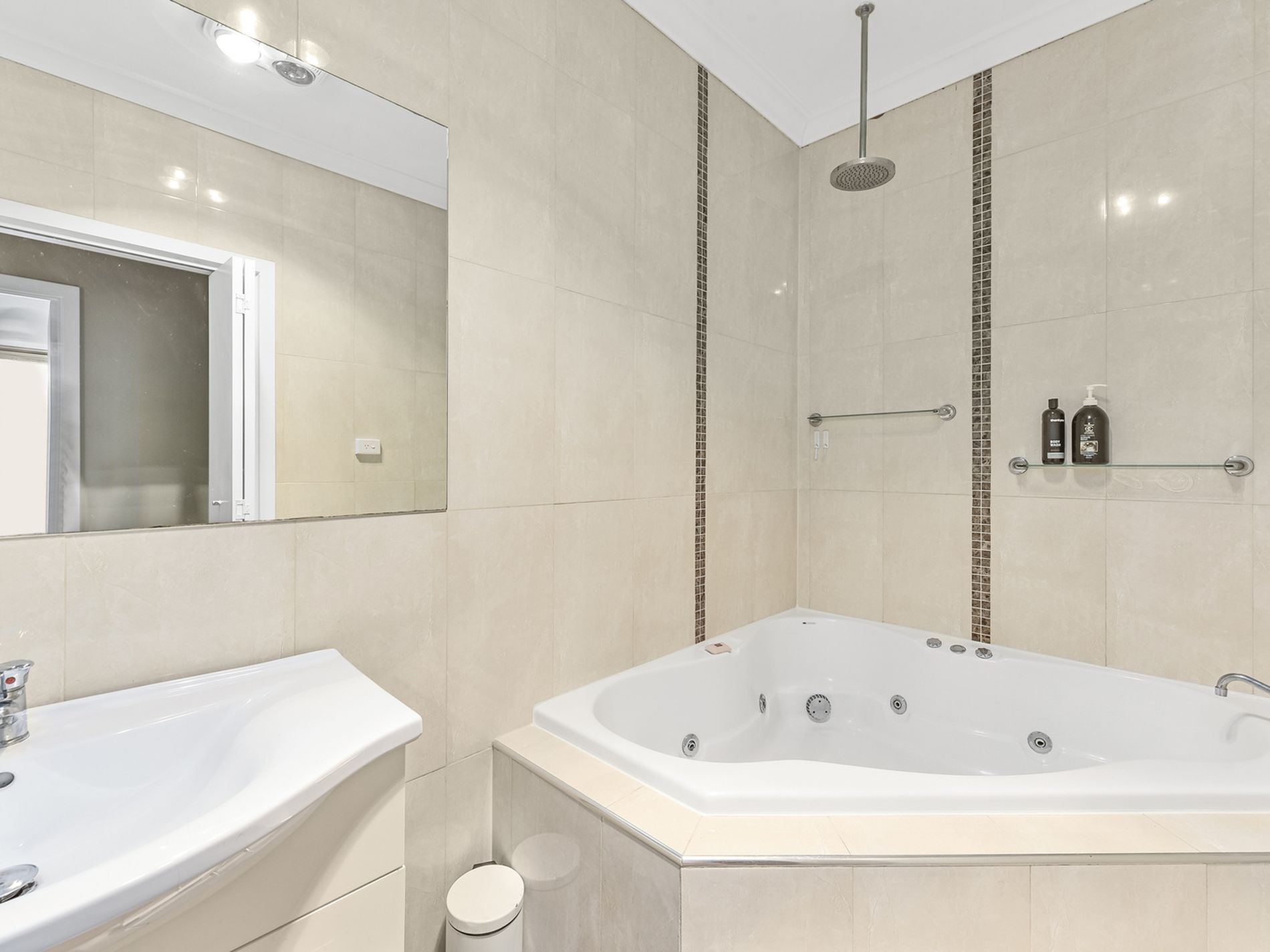 Renovated modern bathroom fully tiled to the ceiling. Corner spa bath with waterfall shower head over and vanity.