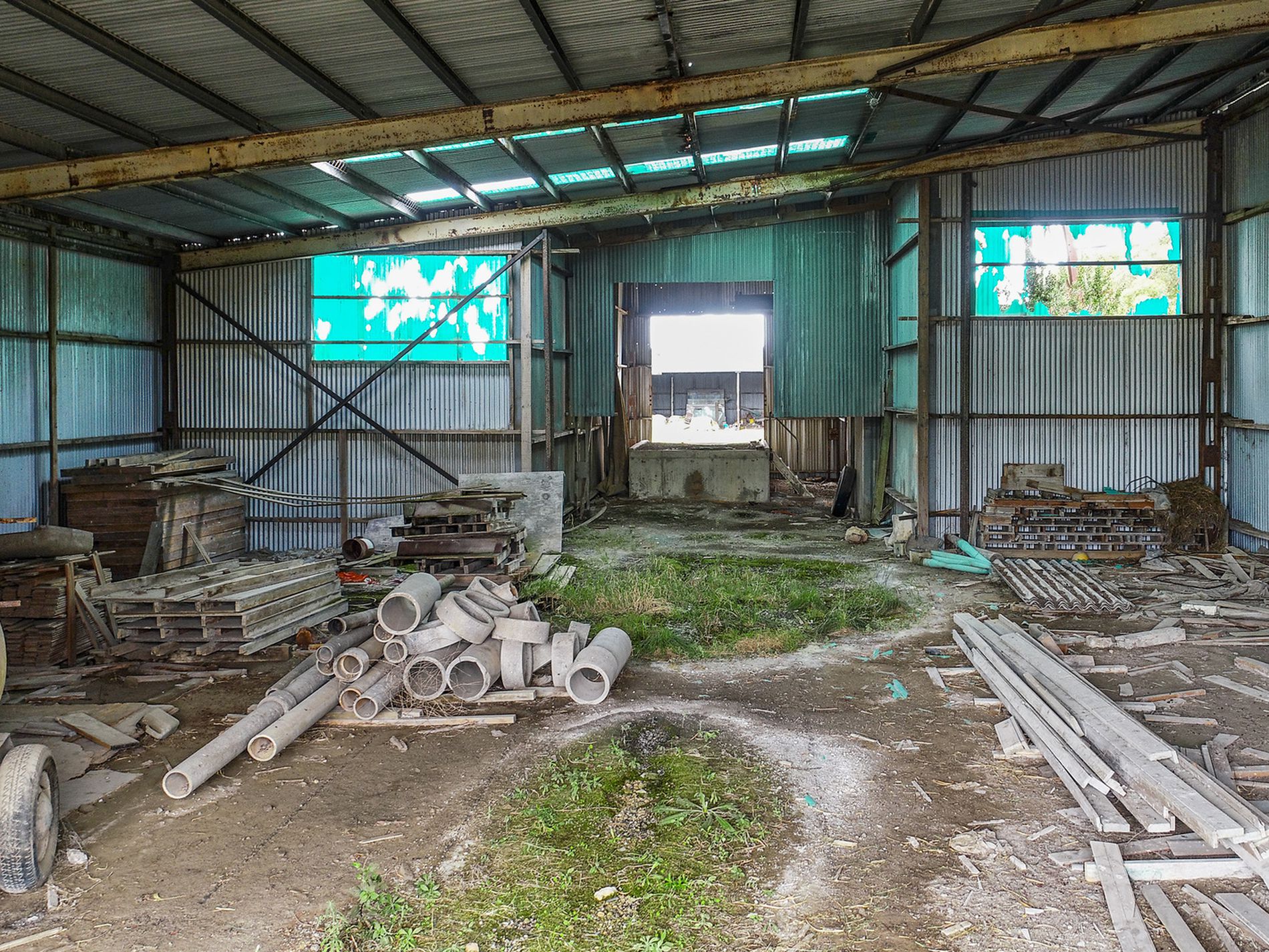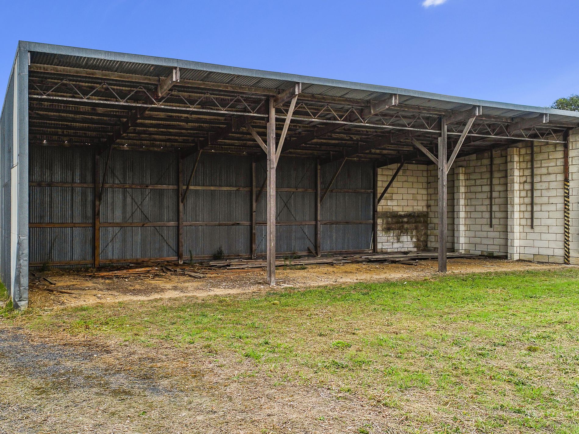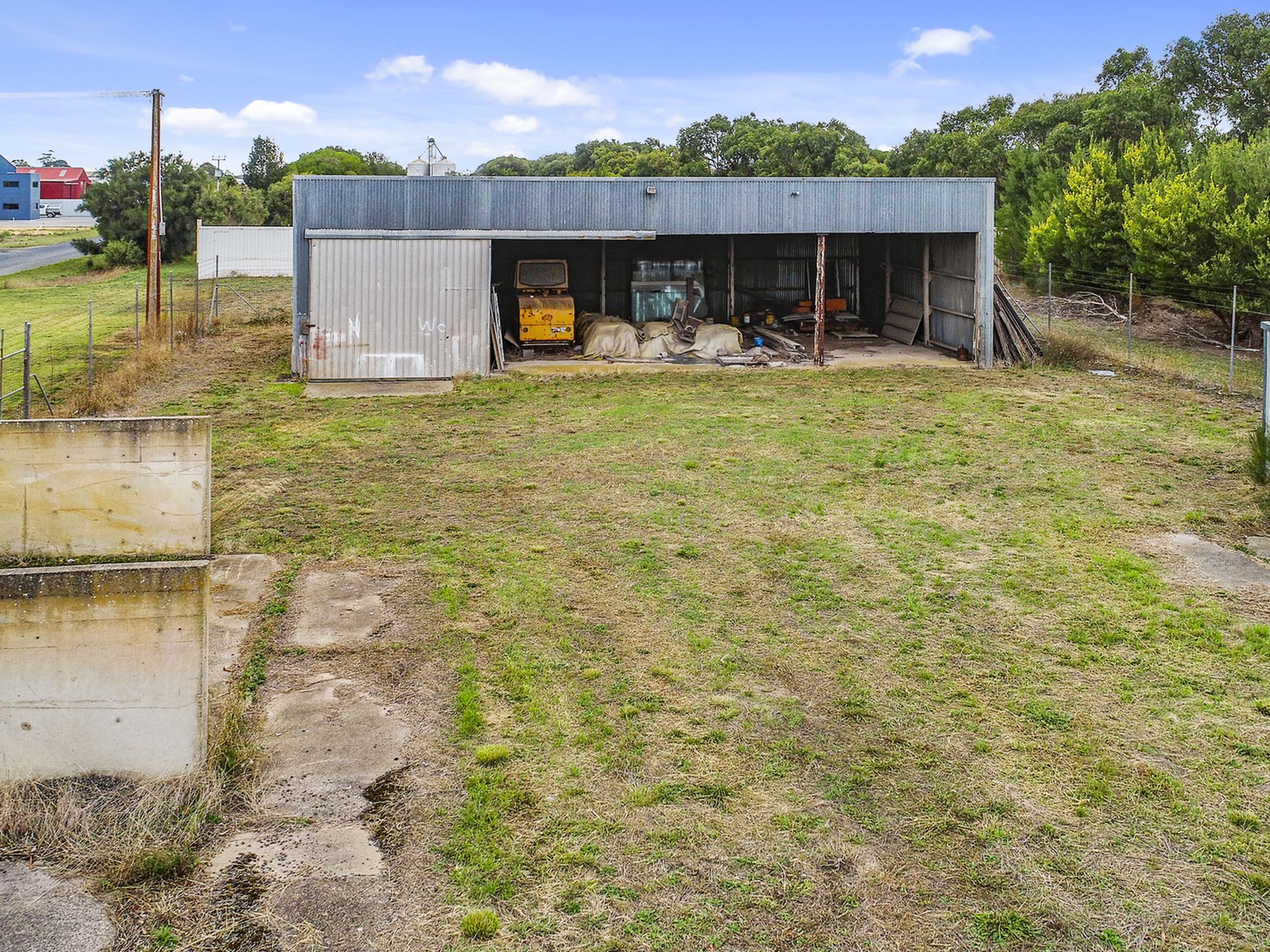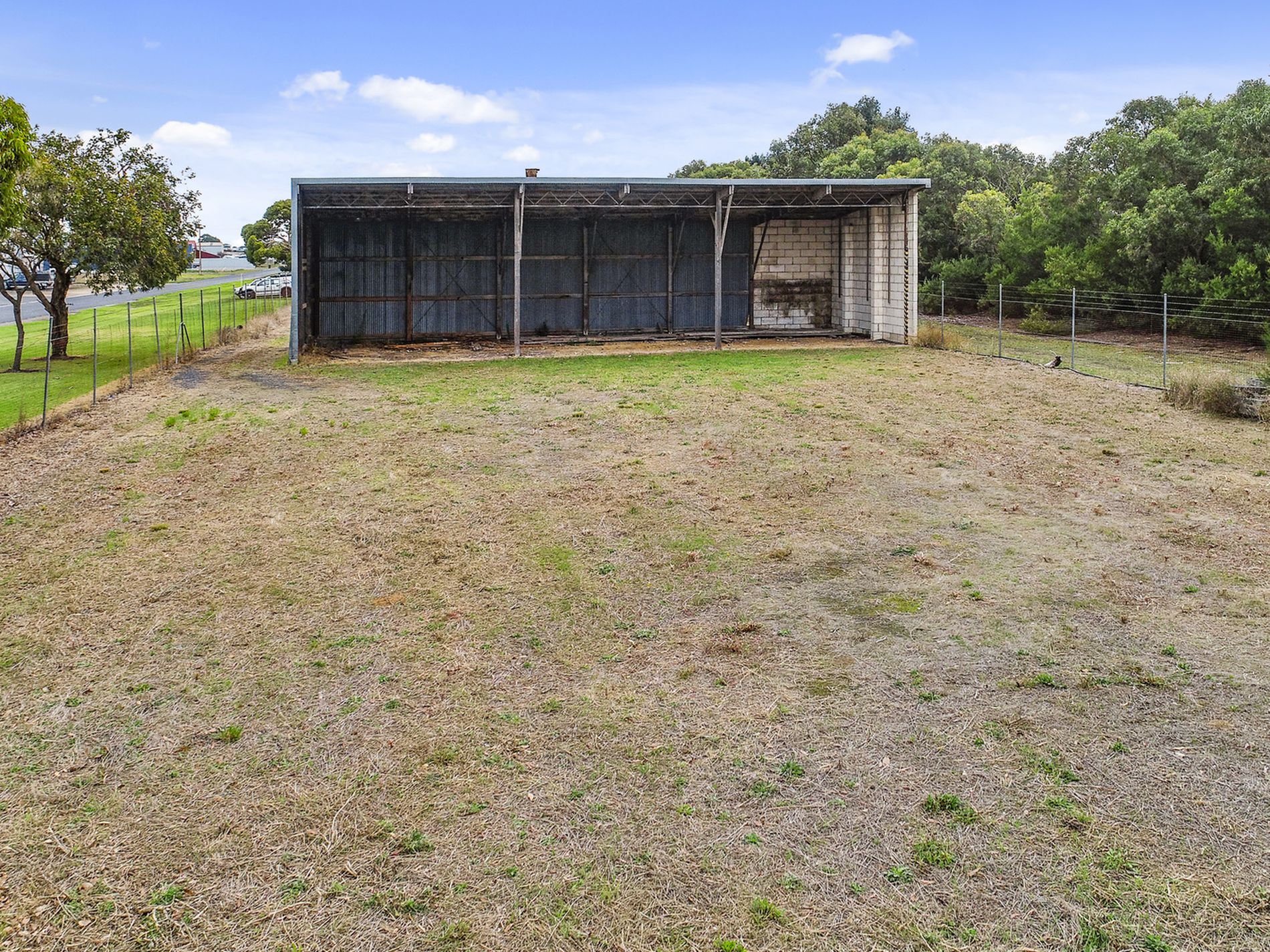 Shedding includes a four bay standard height iron shed with one lockable bay. A huge double ended iron shed with loading ramp and a six bay high clearance iron and stone shed, all will need some maintenance. There are also cement bunkers and a non operational toilet. Town water runs past the front of the property.