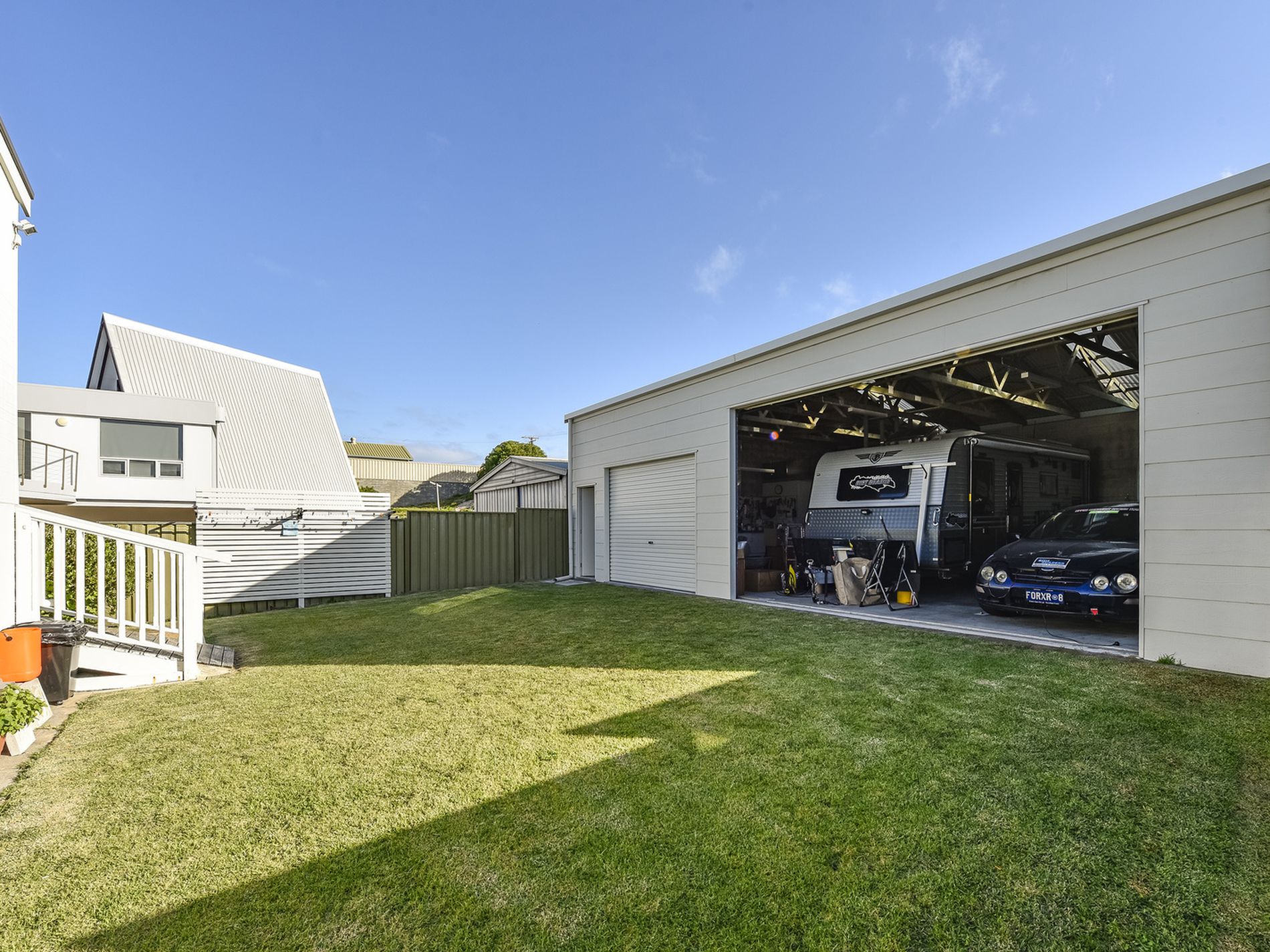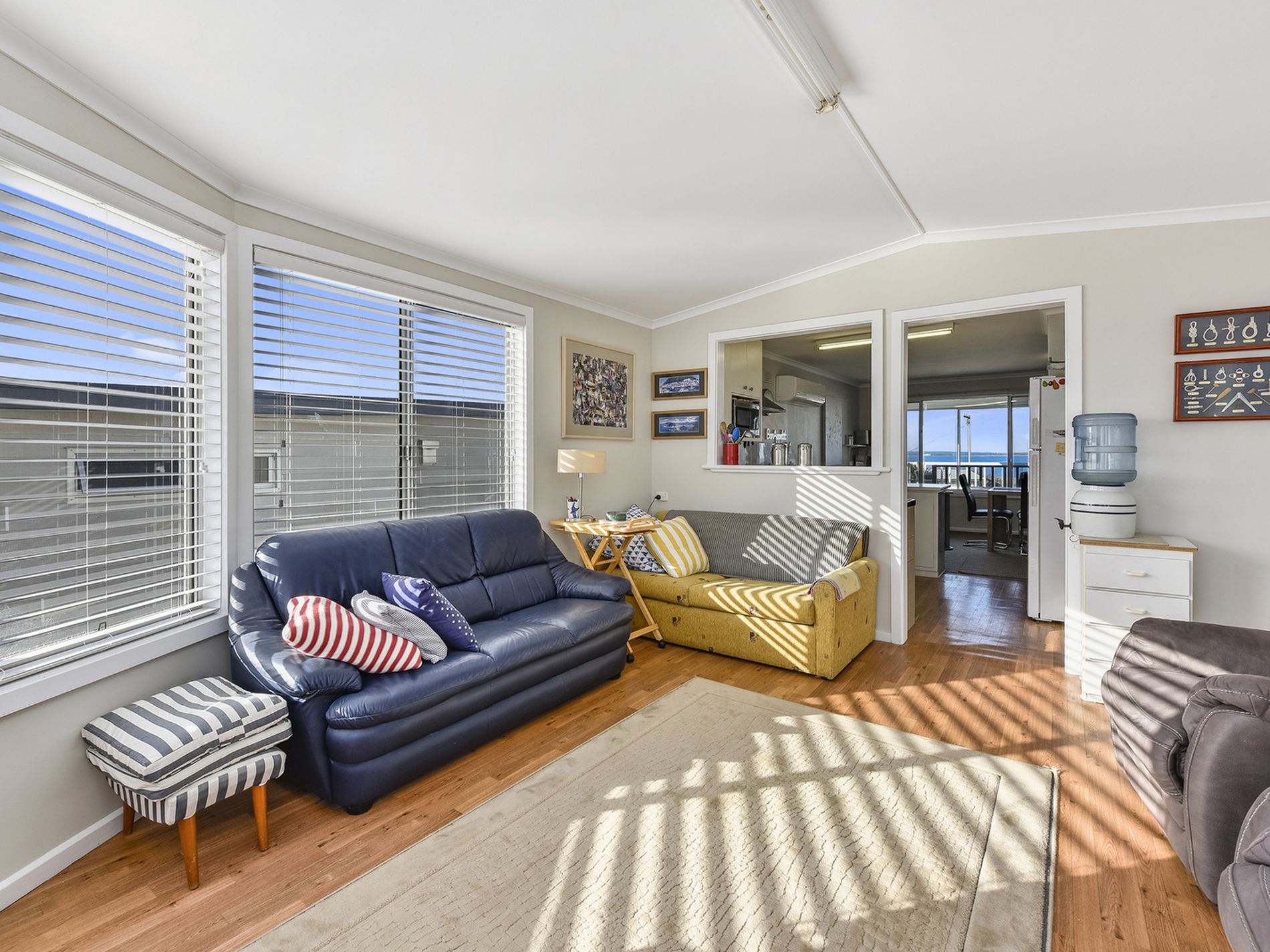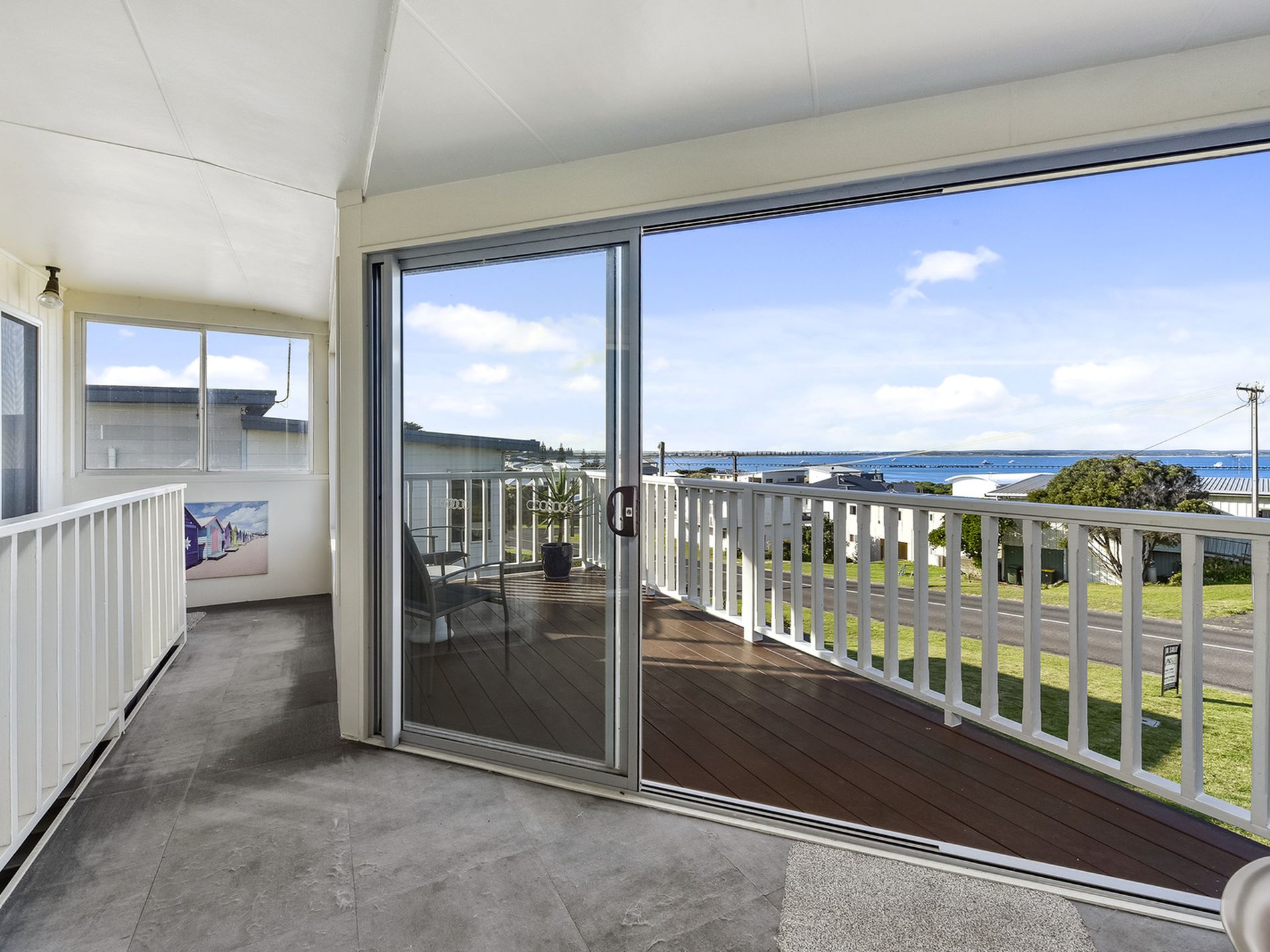 Offers two levels of family living. The upper level is light and bright with Two queen size bedrooms with built in robes, the master has sea views. Kitchen with electric cooking, pantry and breakfast bar. Open dining with views over the bay and a sliding door out to the balcony. A large sun filled lounge has a timber look vinyl floor and blinds and a rear access door with a ramp to the rear yard. The bathroom / laundry has a shower, vanity and wash trough and a separate toilet. The feature of this home is the stunning, spacious front balcony with spectacular ocean views. It is semi enclosed with stacker doors which makes this an all-seasons special place to gather with family and friends.