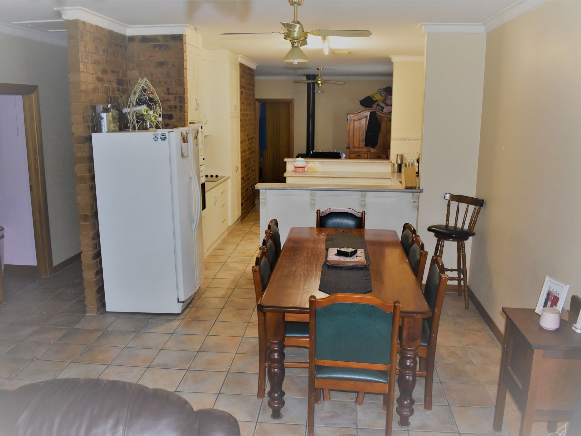 A large open plan lounge, dining, Kitchen and living space is tiled and offers options for family living. The white timber kitchen has plenty of cupboards and drawers, including a pantry, tiled floor, dishwasher and electric cooking. Tiled dining is adjacent and the lounge area flows from here. On the other side of the kitchen the second living space has a slow combustion fire which heats the whole home. There are also ceiling fans in the living space.
