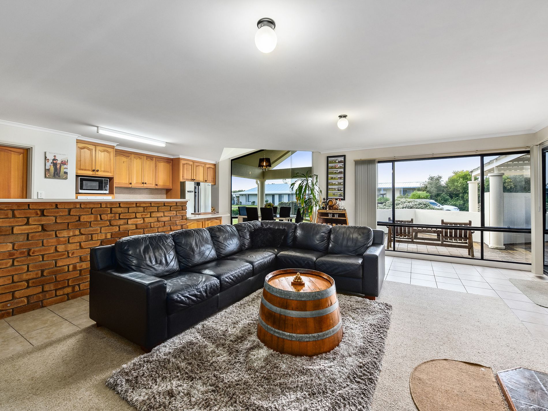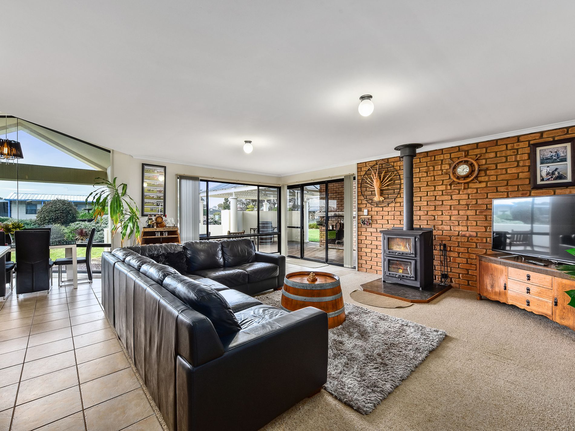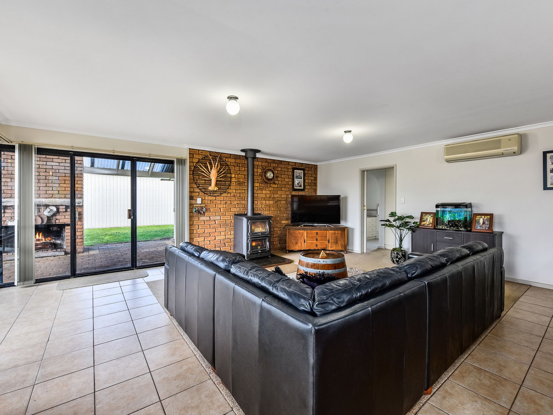 2 living areas separated by kitchen. Both lounges are carpeted with family room offering Slow combustion fire and R/C air conditioning.