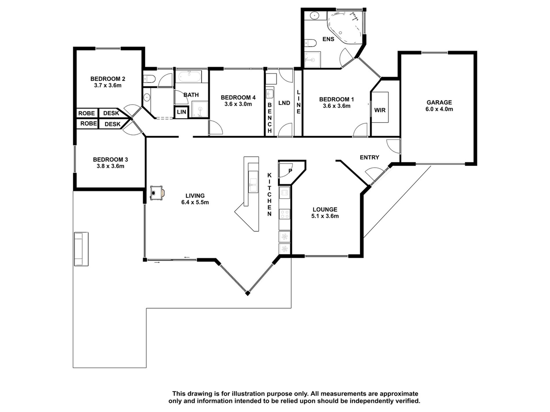 4 bedrooms with Main and ensuite [including spa corner bath, shower and toilet, plus walk in robe. Bed 2 & 3 both have built-in robes and desks. Bed 4 also works as office and all carpeted.