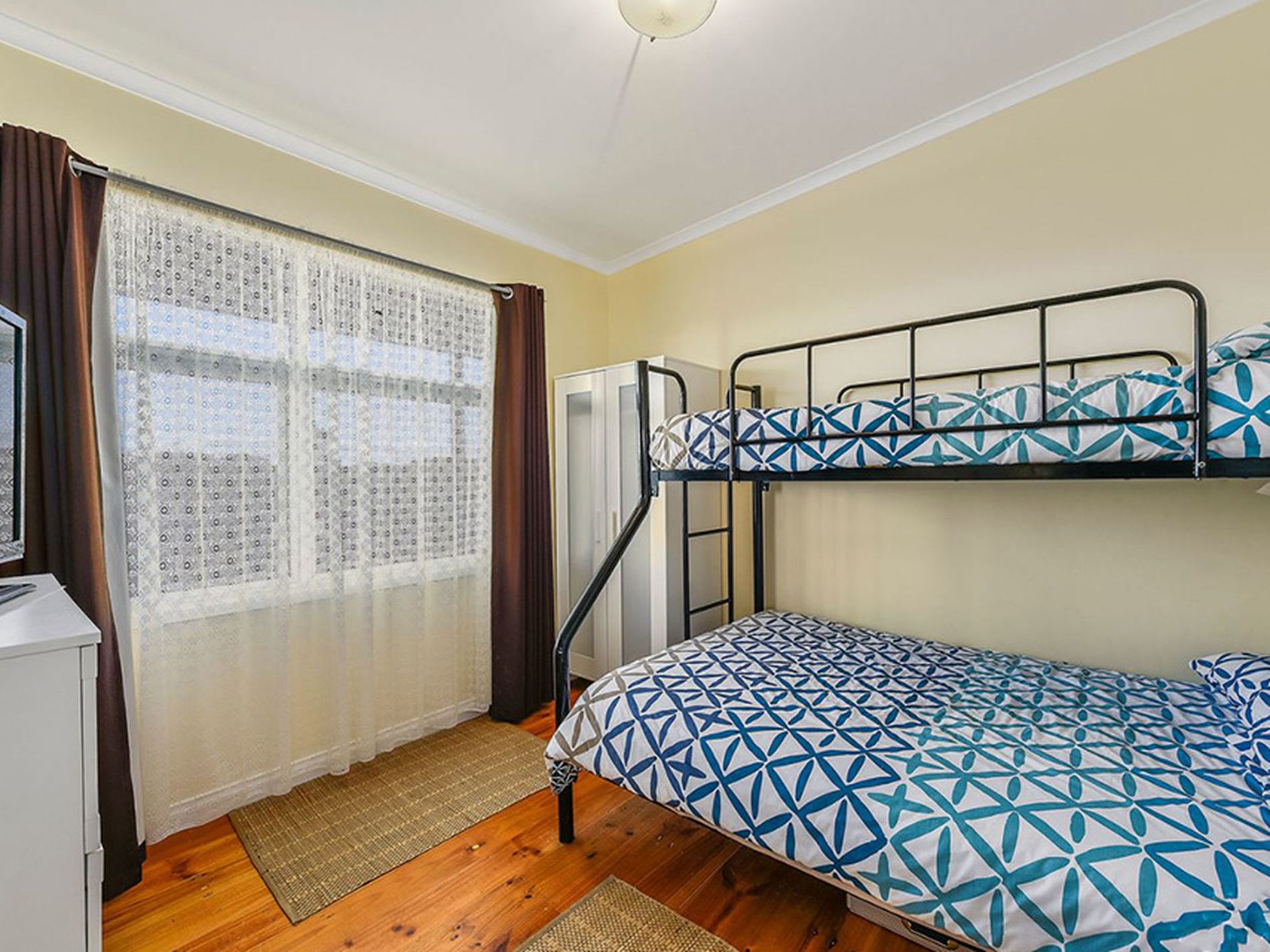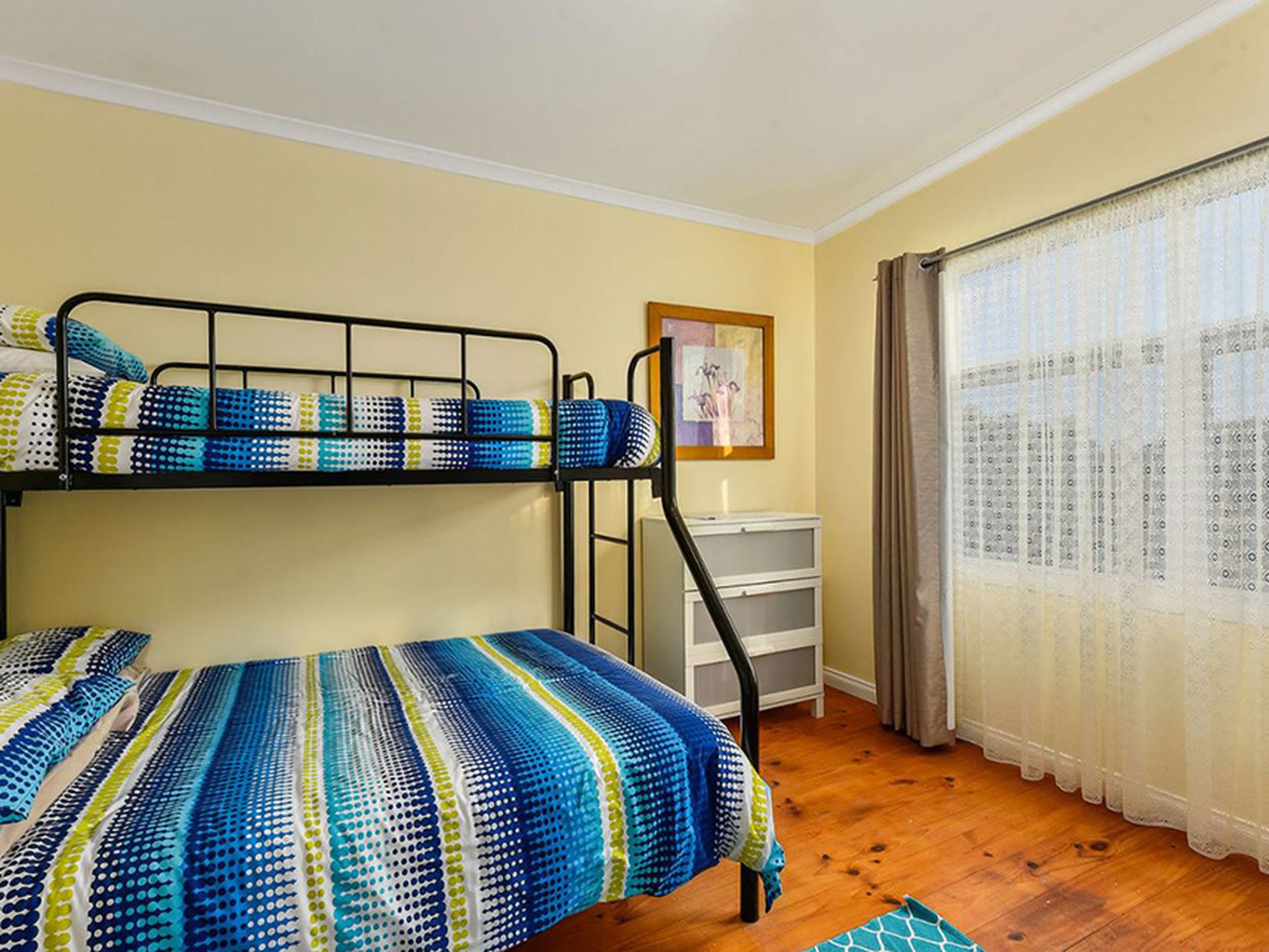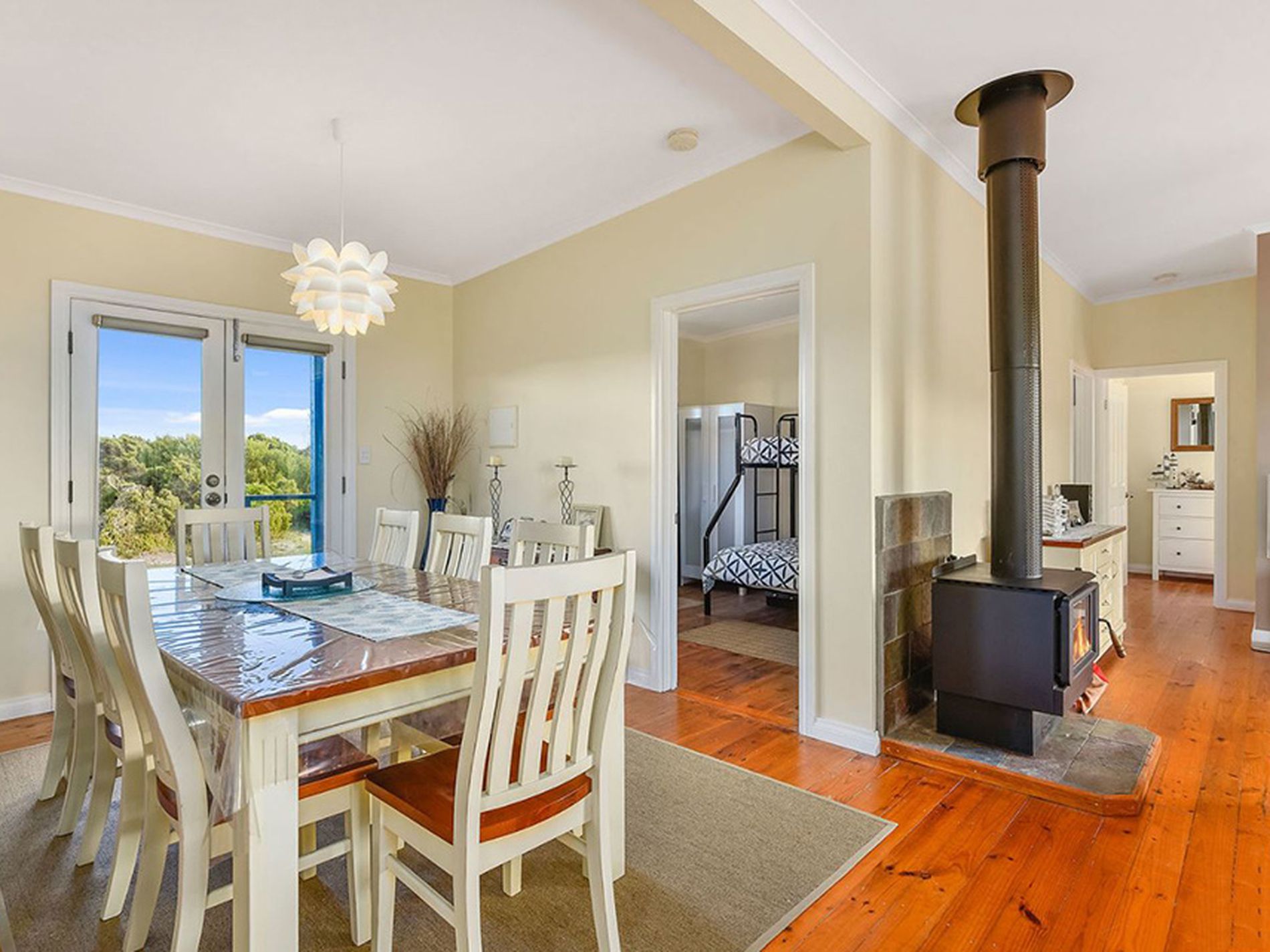 Walk off of the front verandah through French doors into the light filled open plan kitchen, dining, living space with polished timber boards. An inviting space you cant help but relax in when all you can see through the large windows is native bush. A slow combustion wood fire keeps you cosy and warm in the cooler months and a reverse cycle air conditioner provides great climate control to keep you comfortable all year round. The well appointed kitchen with double aspect windows is a pleasure to cook in with ample storage and preparation areas. It has a large pantry, breakfast bar, dishwasher, rangehood, gas cooktop & electric oven. There are three good size double bedrooms with polished timber floors and large windows letting in plenty of natural light. The bathroom is modern with a seaside vibe and the laundry has built in cabinetry.