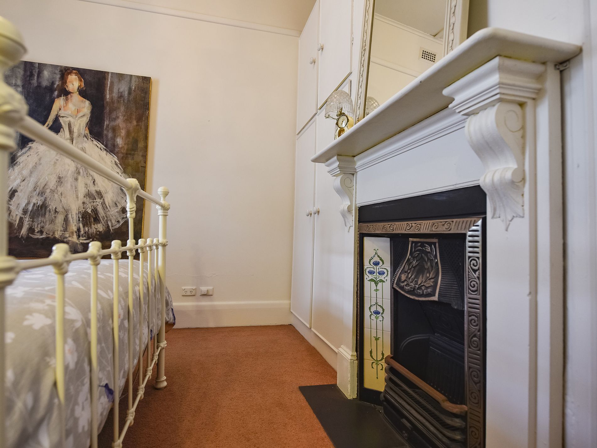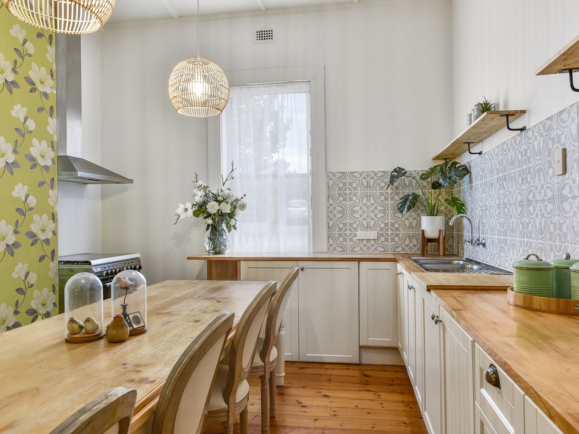 Walk through the front door into the wide passage with timber floors, a large bedroom sits on each side, both have carpeted floors, beautiful ornamental fireplaces, and curtains, one has built in robes. Walk through the passage to the stunning Hampton's style open plan kitchen, dining, and family. The kitchen has white cabinetry, timber benchtops, feature shelving and modern splashback tiles. You will cook on a 900mm five burner gas cooktop and oven while watching the family in the adjacent living room. Original Baltic floors are again a feature here and go beautifully with the new modern kitchen.