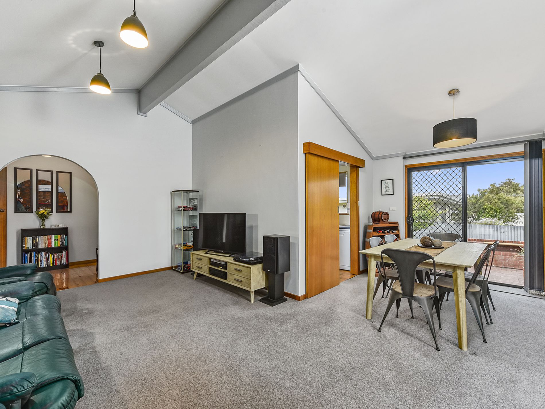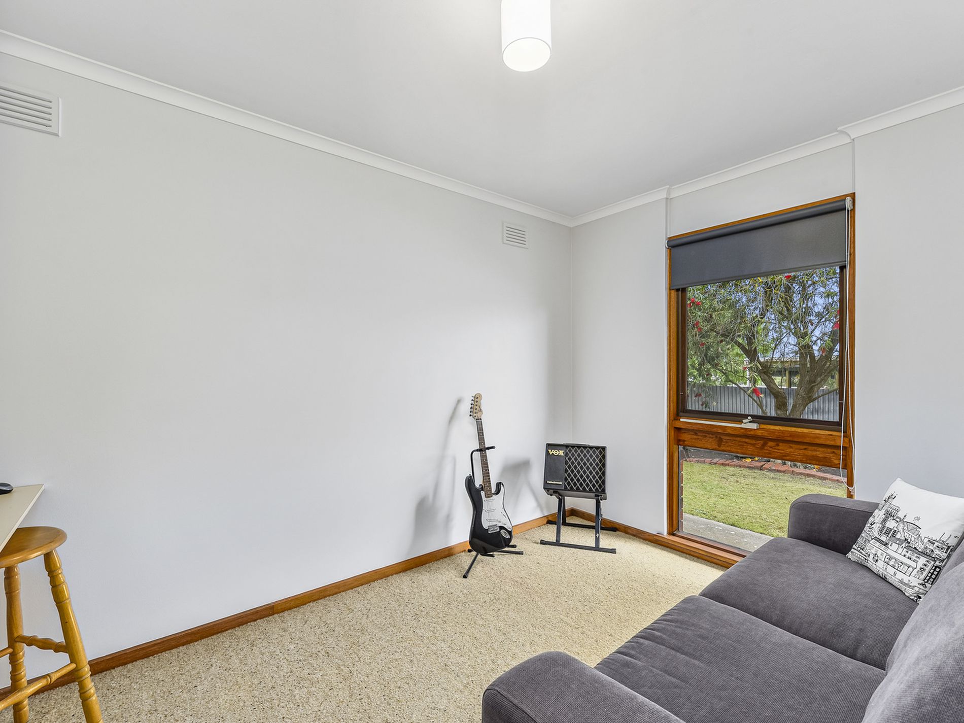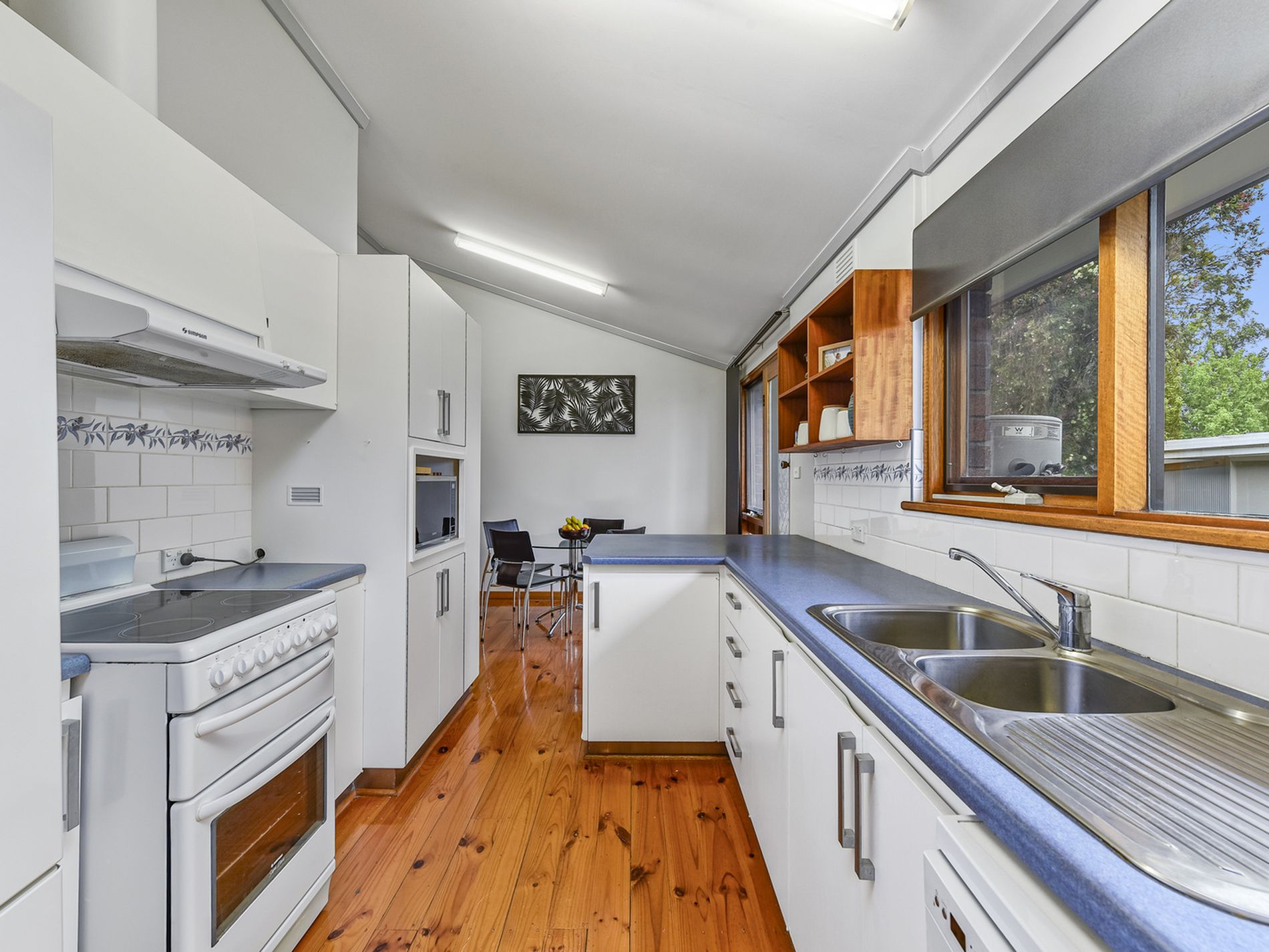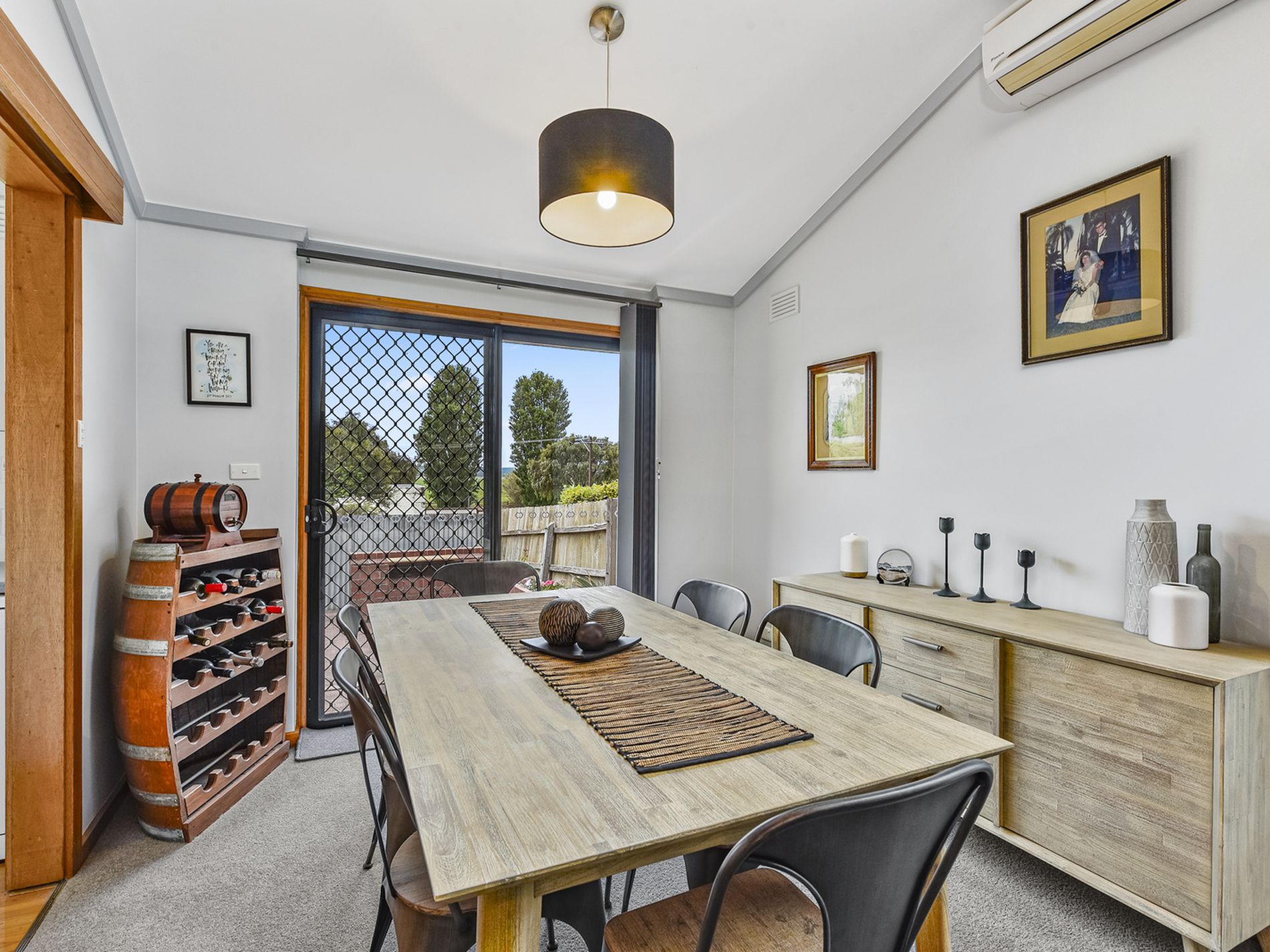 Driving into the paved driveway it is immediately obvious the pride and care the current owners have taken maintaining this home. As you enter the home via the extensive carport, convenient during those wet winter months, you will find yourself in the heart of the home. A roomy entrance area leads into the spacious, L shaped carpeted, lounge and dining area. This area features beautiful, raked ceilings making it feel spacious and large windows flooding the space with natural light. A commanding brick open fireplace is a feature and adds character. This makes it a cosy space to snuggle up with a book in the dark, cold depths of winter. A glass sliding door out to the BBQ area from the dining space has beautiful vistas of the farmlands and beyond, completing the area. A reverse cycle air conditioner here helps heat and cool the home all year round.