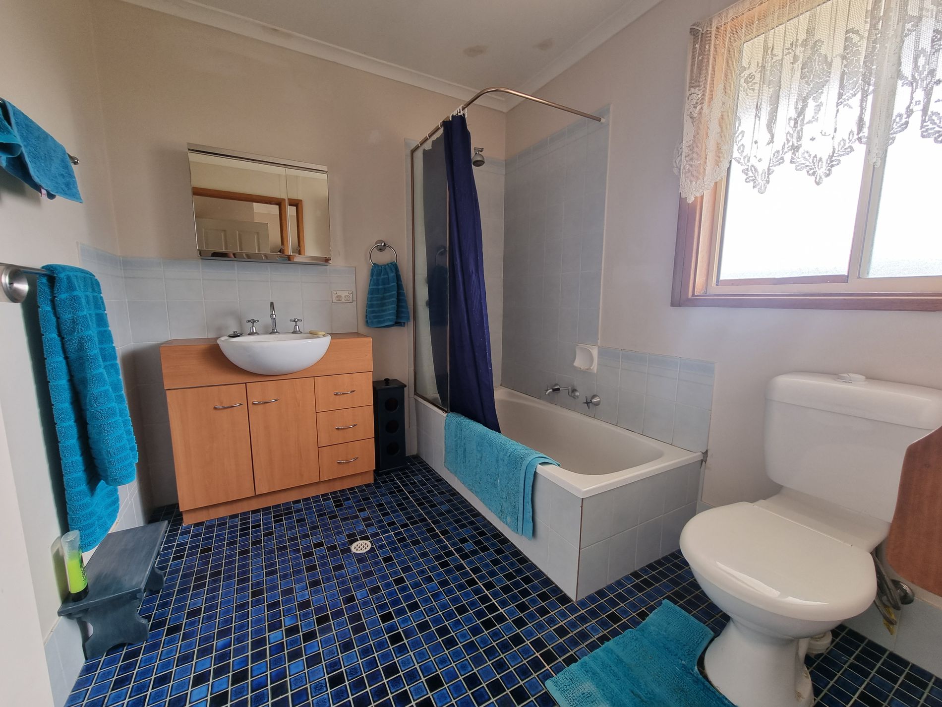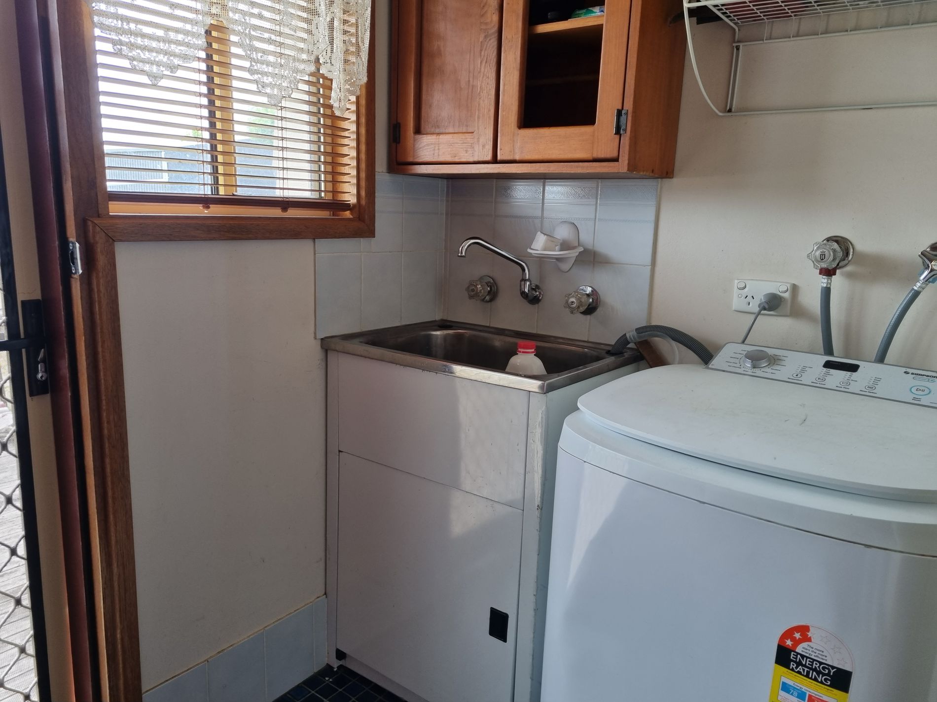 Generous sized bathroom with shower over the bath, vanity, and toilet. Laundry opposite with rear door to outdoor open deck to entertain one.
