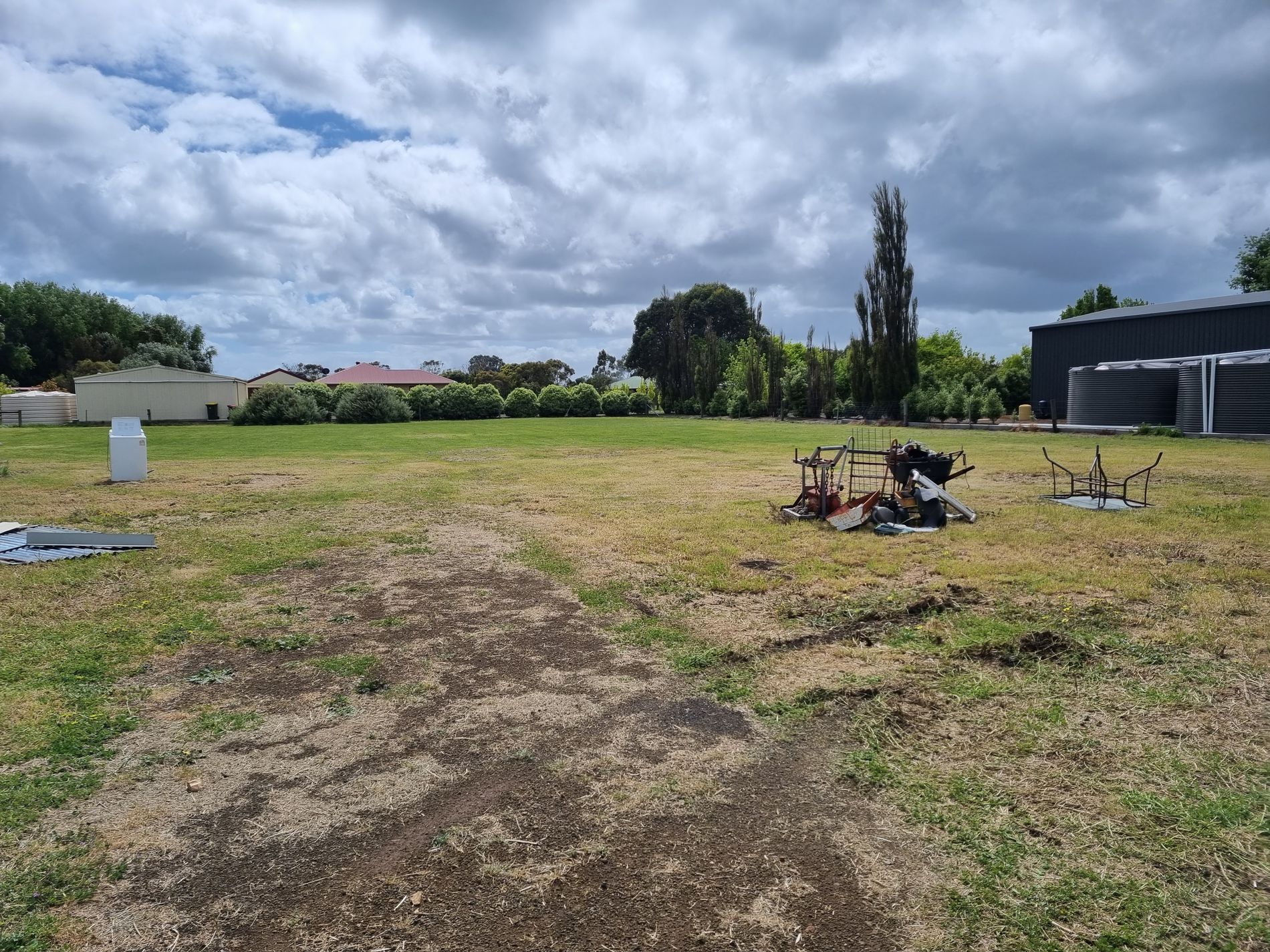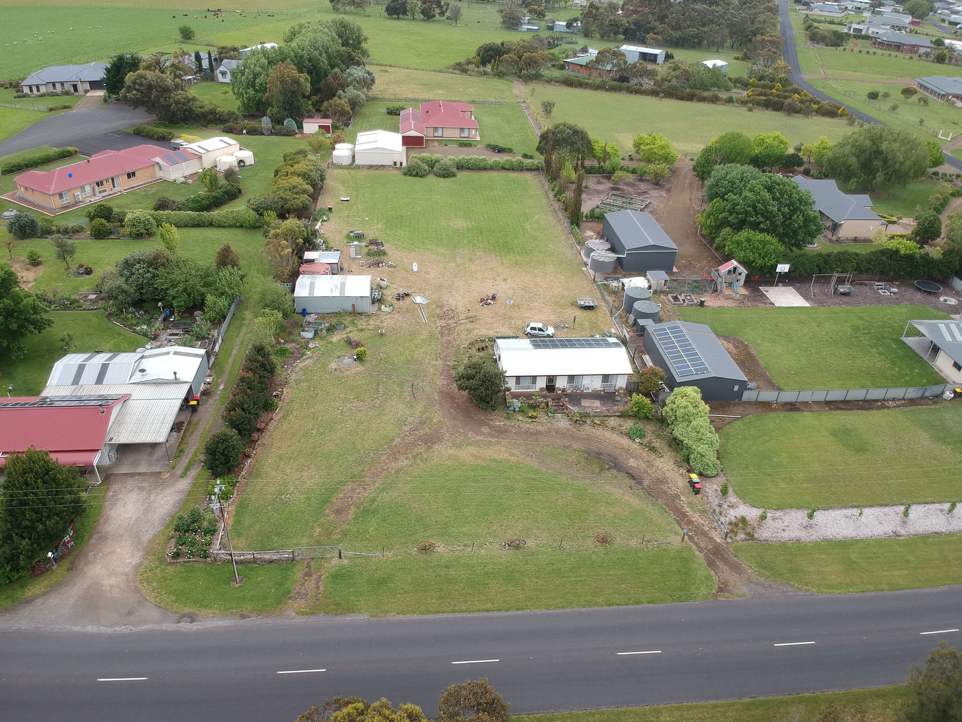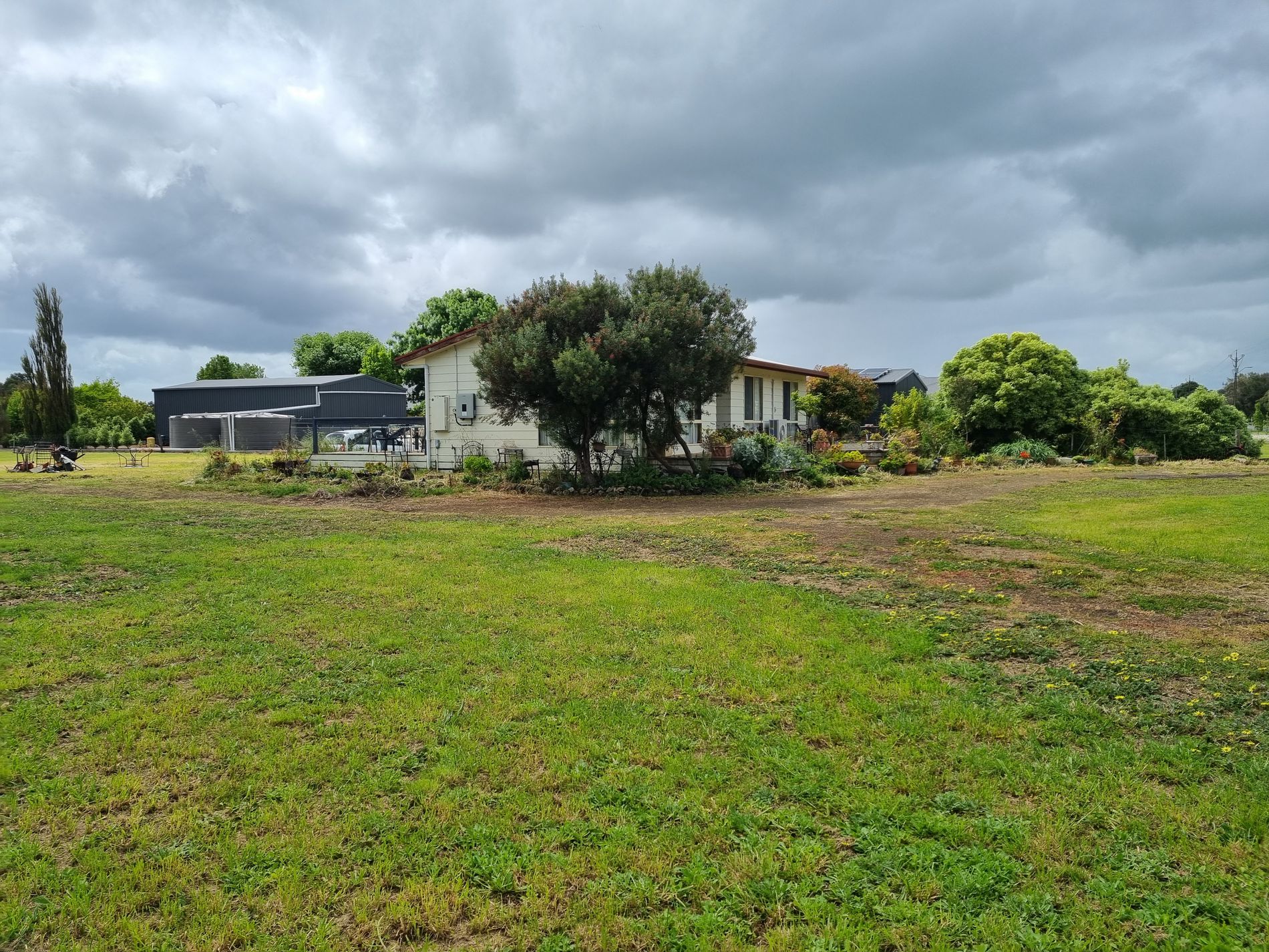 16 Solar panels of 4.6kw. 10,000-gallon rainwater and equipped bore to cover yard, garden and the toilet is on bore only. Biocycle septic waste system. Double galv. shed with power.