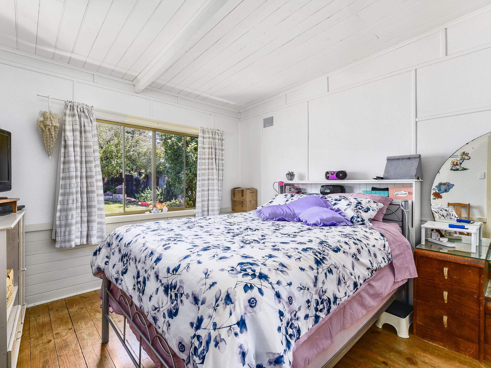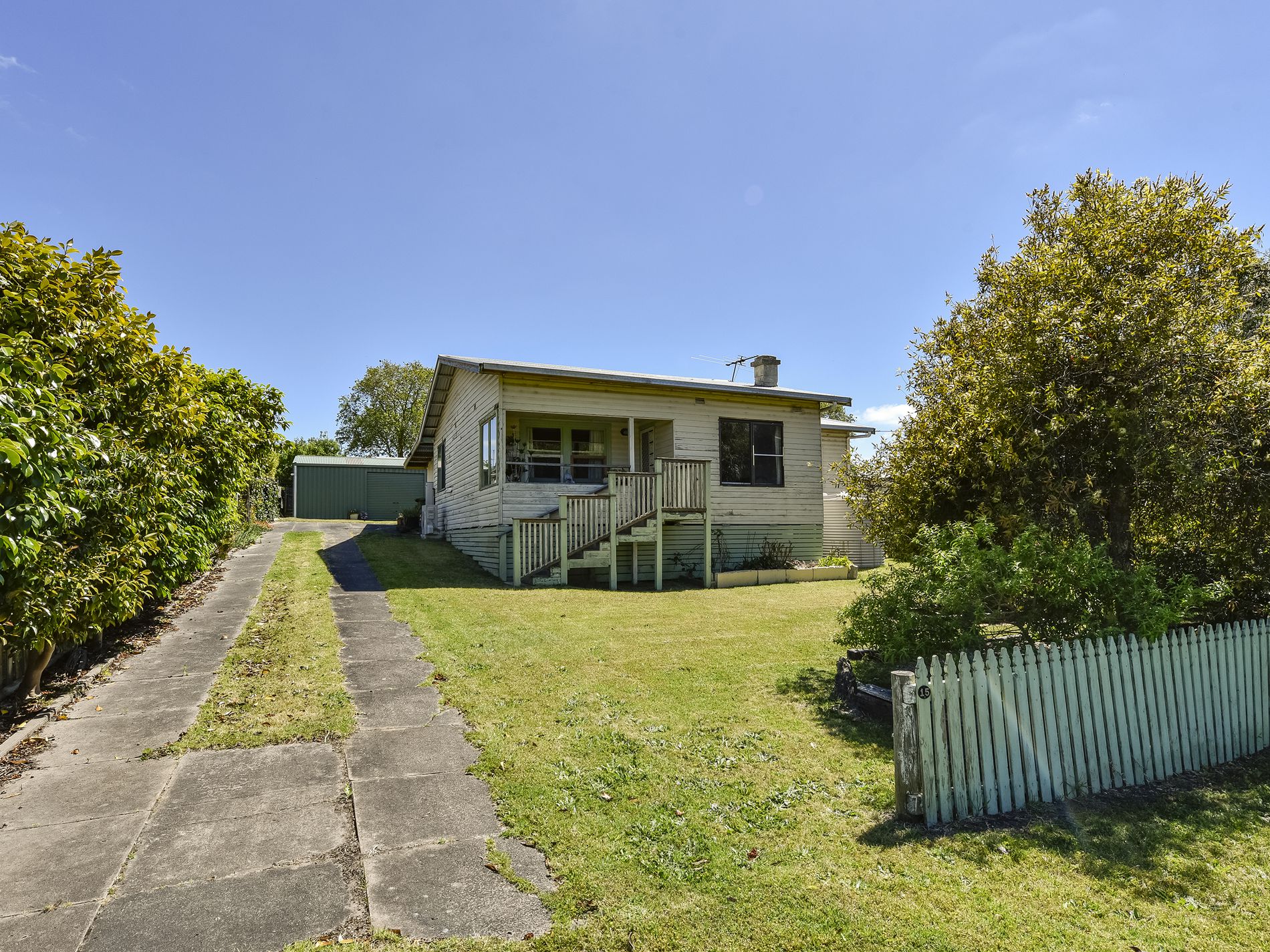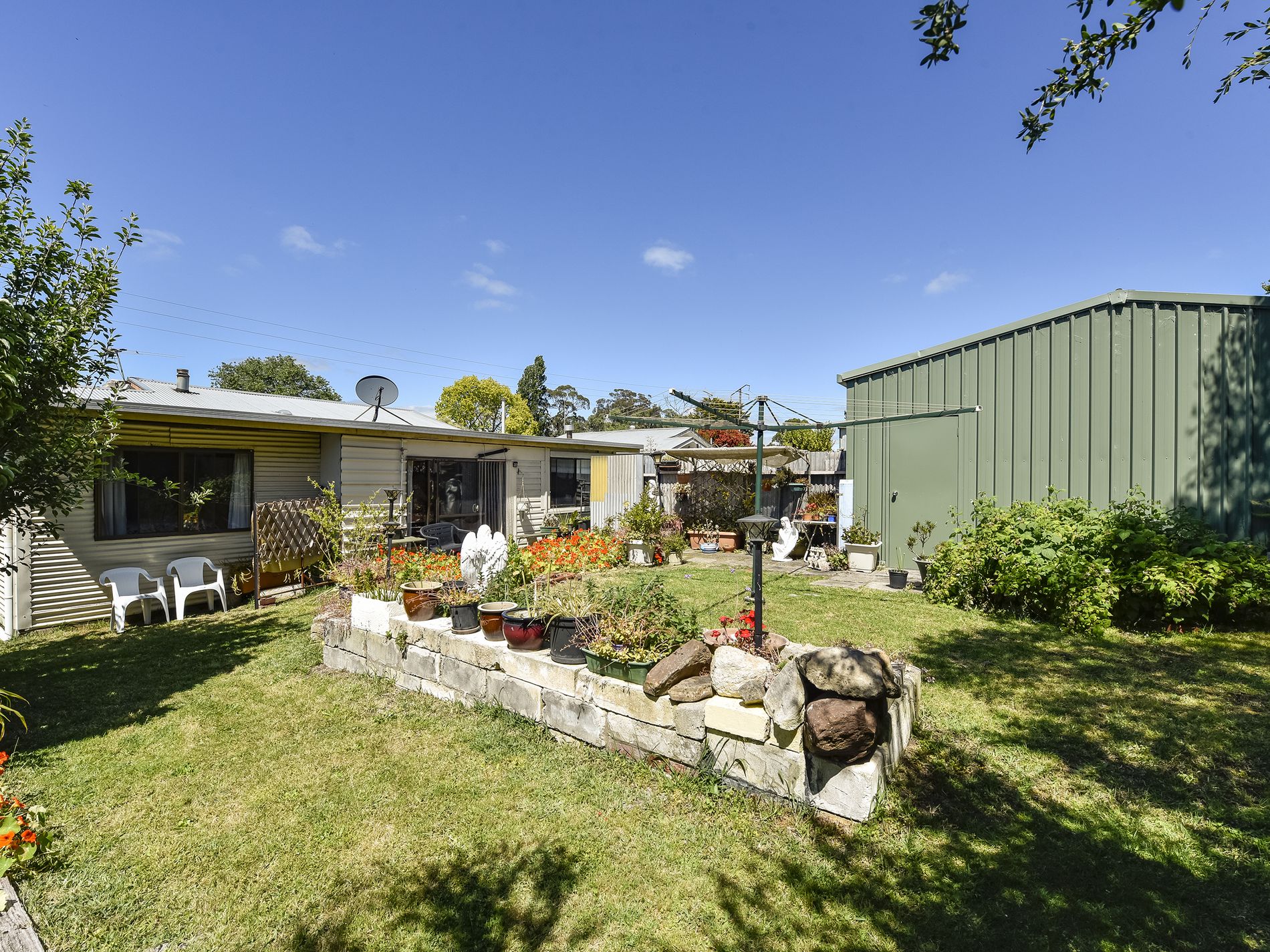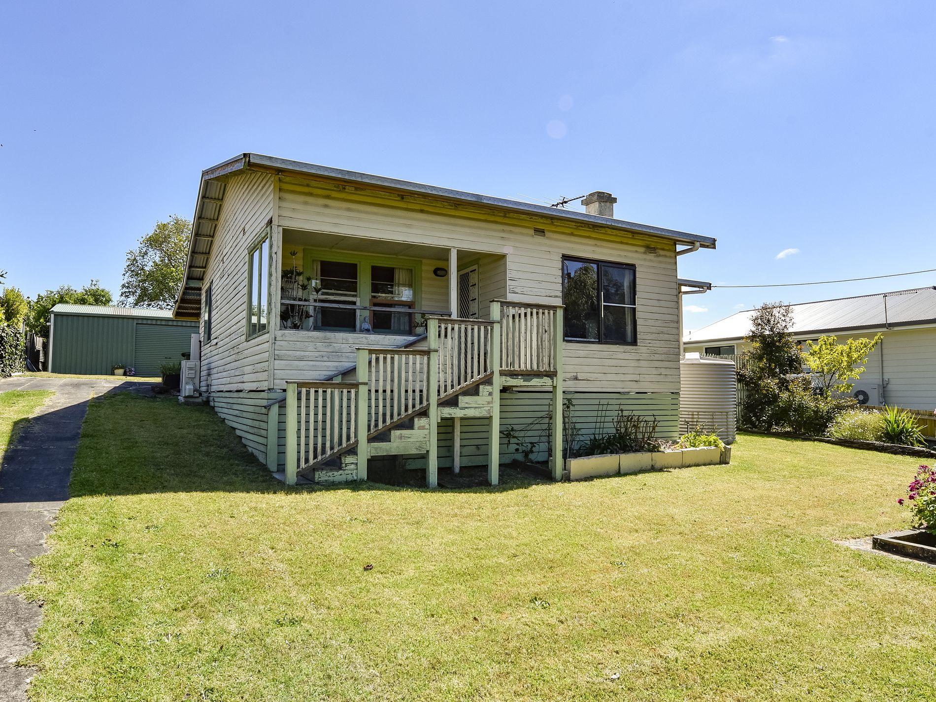 Outside there is a three bay colourbond shed with shelving, roller door and PA door with a path leading to the rear of the home. Established gardens and trees make a private rear yard with access up the driveway. A rainwater tank has a tap for drinking while the home is serviced by town water and sewer. There is loads of potential here for the handyman.