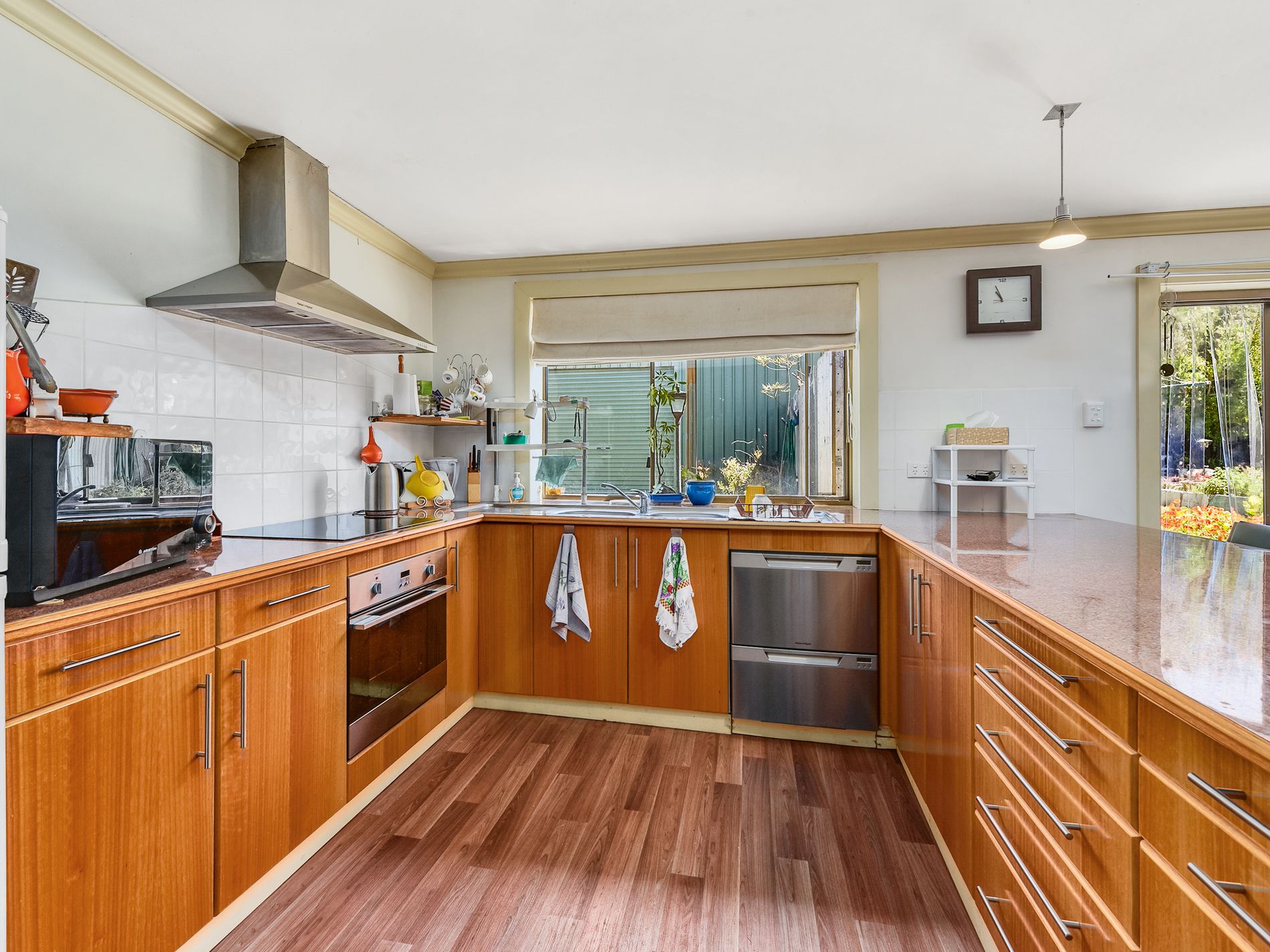 Walk up the timber steps to the front porch, open the front door and you will be surprised. A massive open plan living, dining, kitchen area greets you providing many options when it comes to utilising the space. The kitchen has been renovated and with quality appliances and has plenty of room for your master chef to cook up a storm. Timber floors and timber look vinyl make the space pet and kid friendly while a slow combustion wood fire and reverse cycle air conditioner keep the home at a comfortable temperature all year round. There are four bedrooms off of this space with the option for one to be utilised as a walk in dressing room. The master bathroom has also been updated and has a generous shower, vanity and ample storage along with the toilet. The laundry trough is also here.