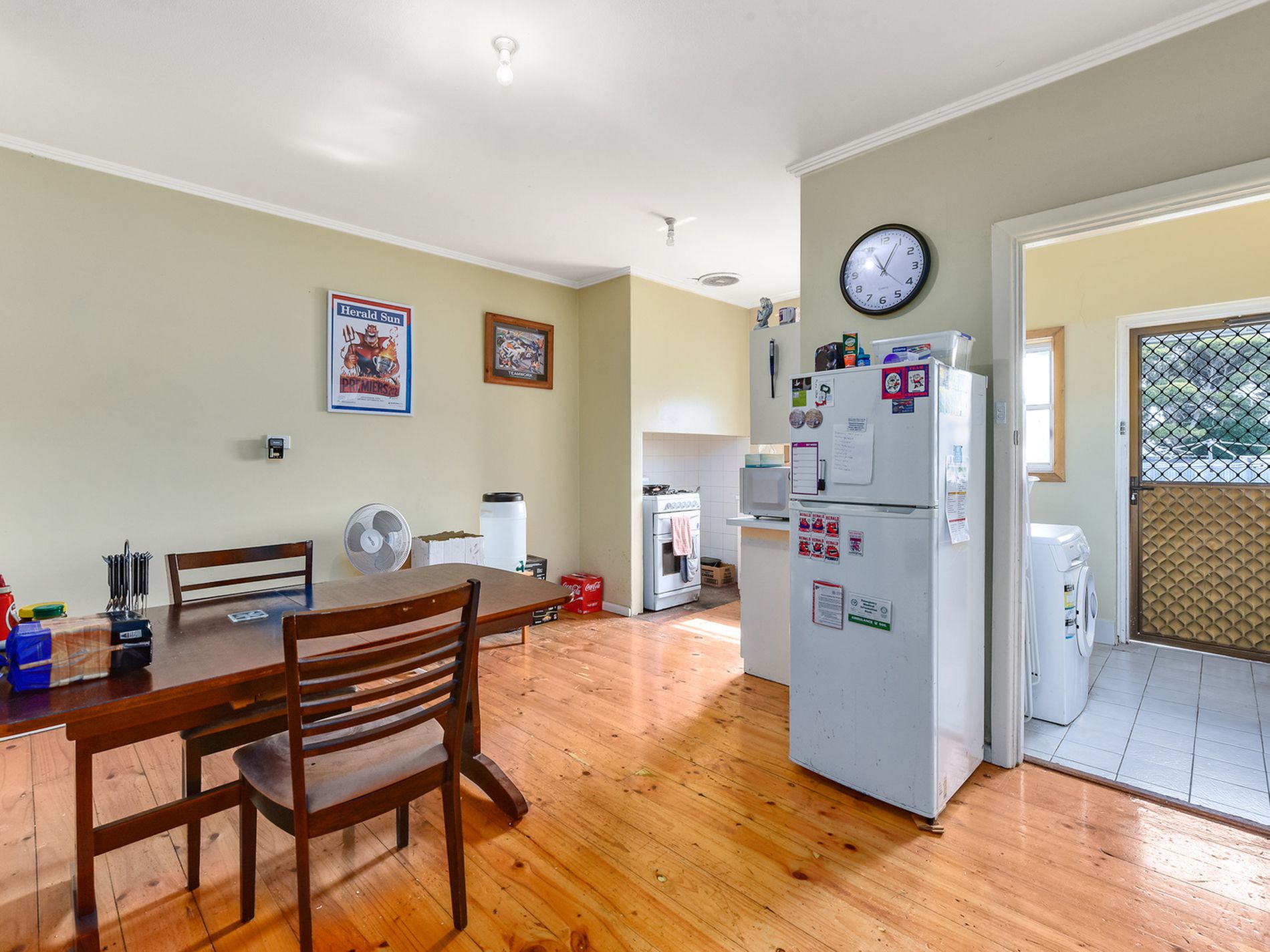 An original kitchen has polished timber floors, freestanding gas cooking and excellent storage with two floor to ceiling built in cupboards.