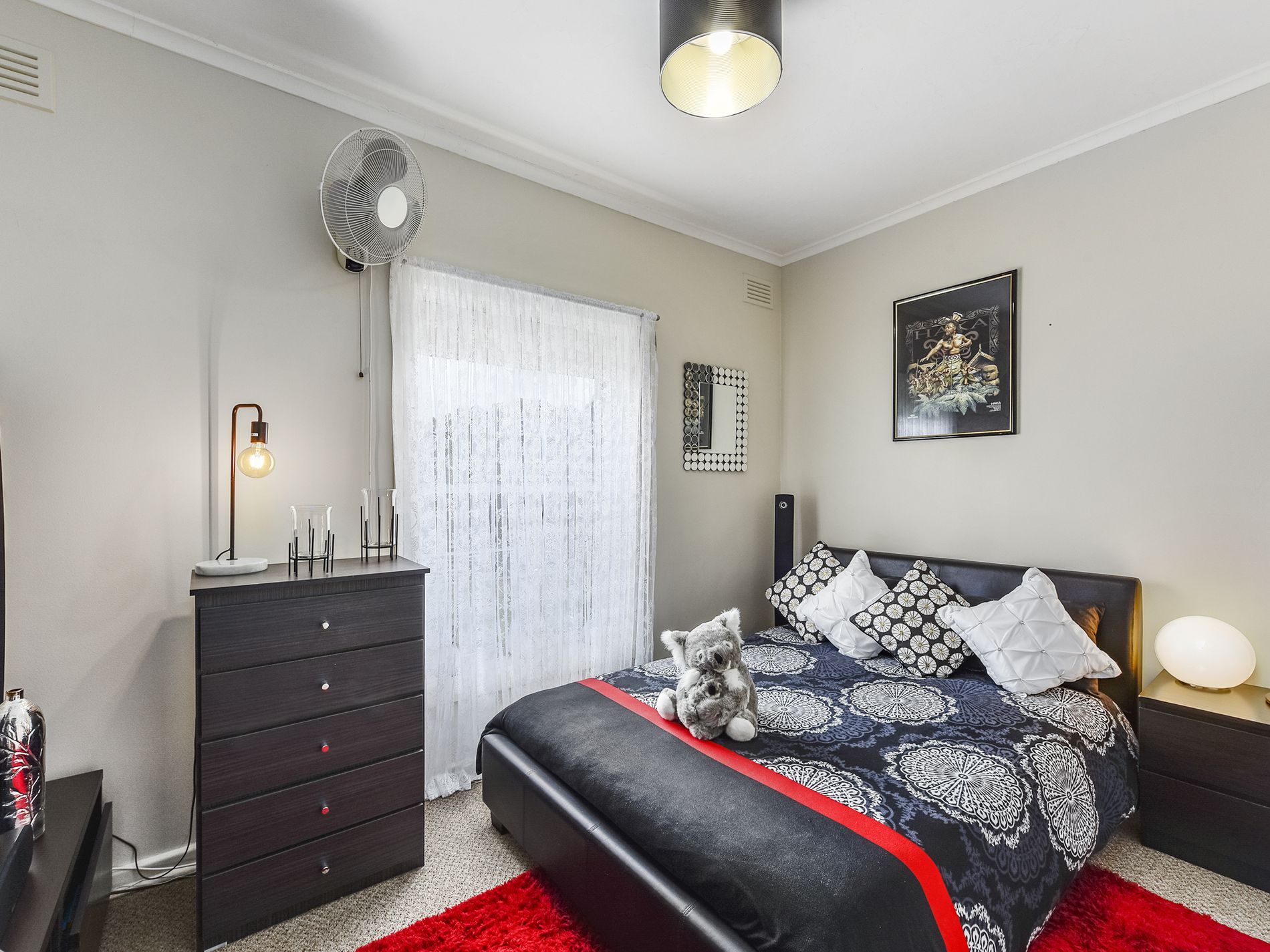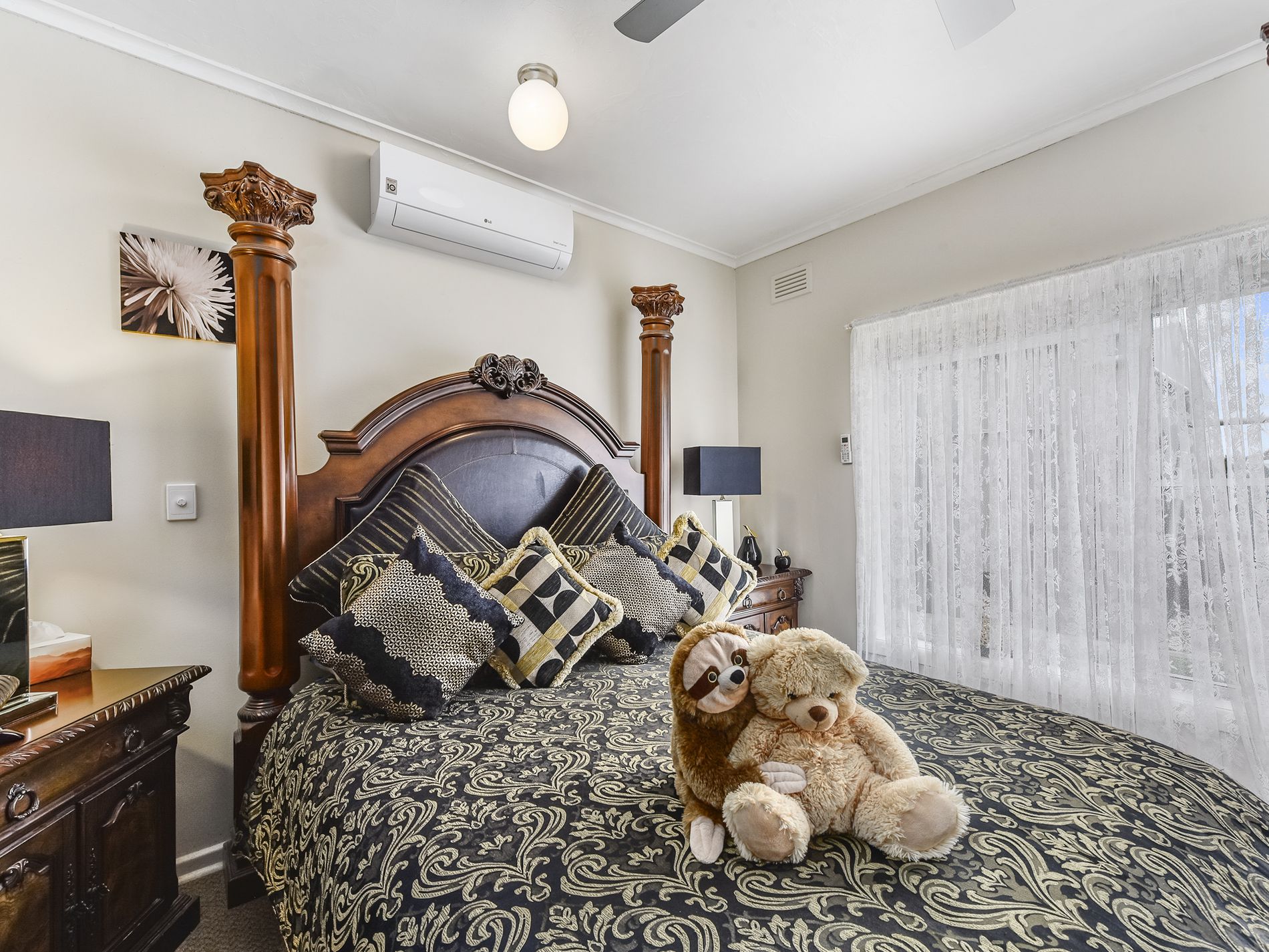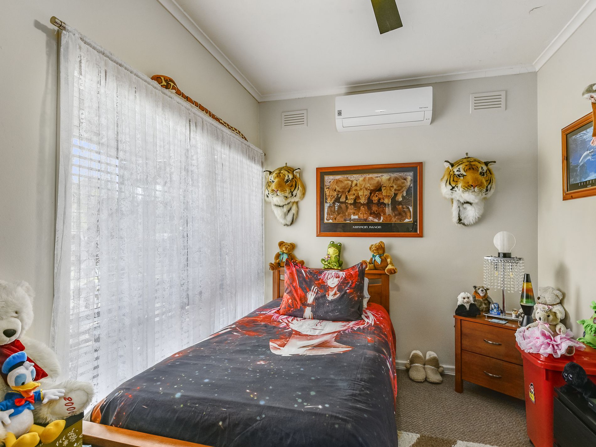The second bedroom includes a ceiling fan and yet another split system air-conditioner.