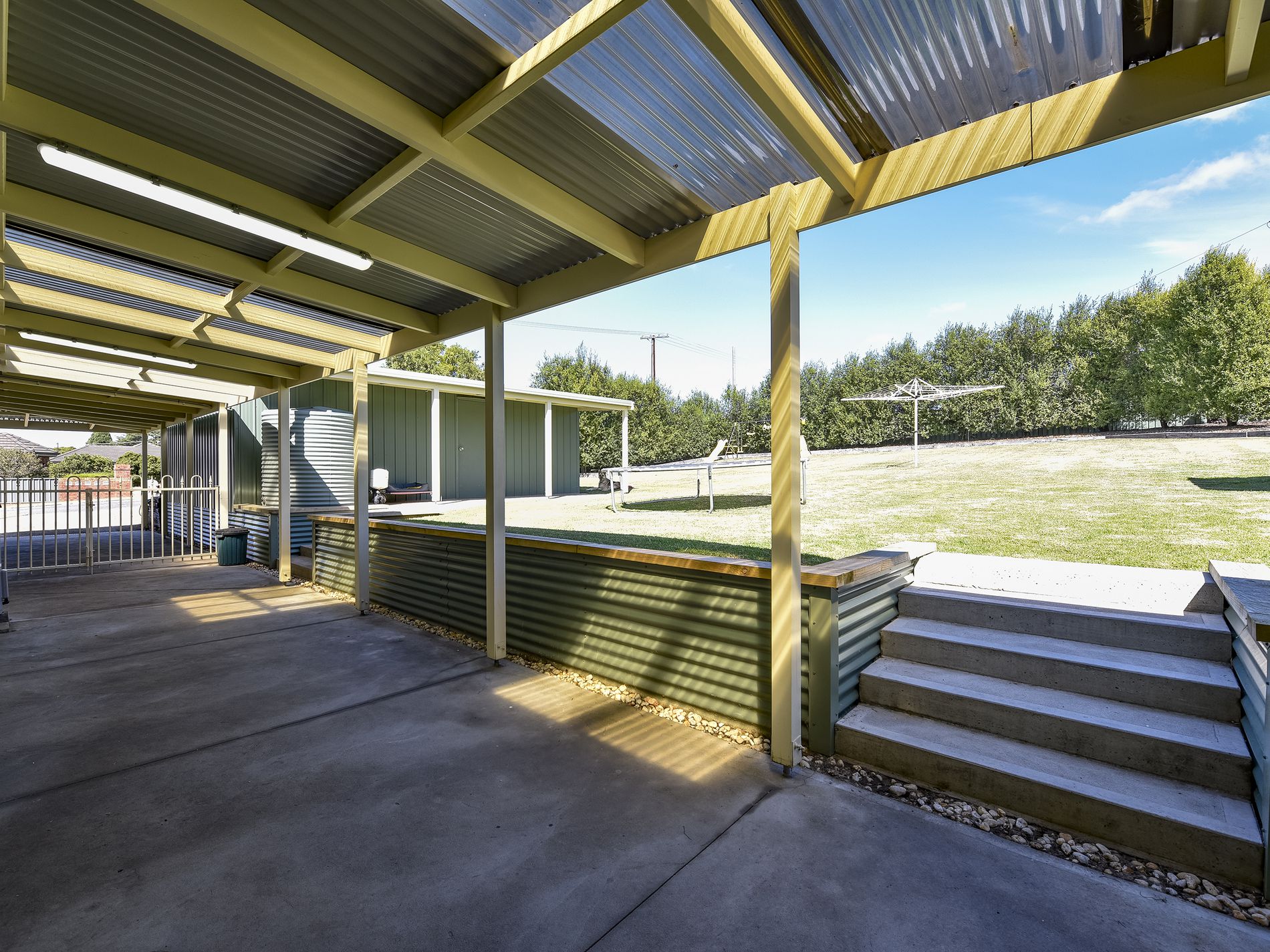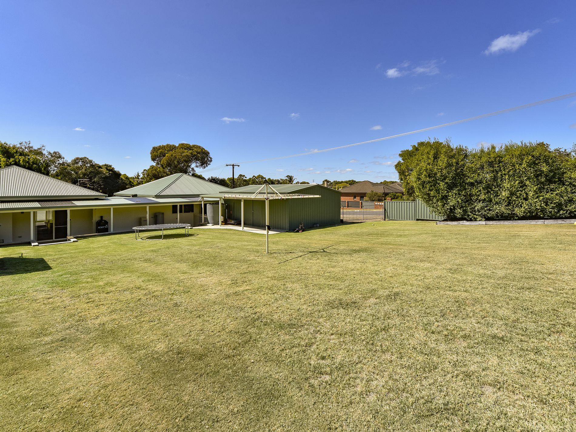 The yard itself is a carpet of lawn with privacy hedging all around the edge. You have a garden shed and a pump and bore service the garden.