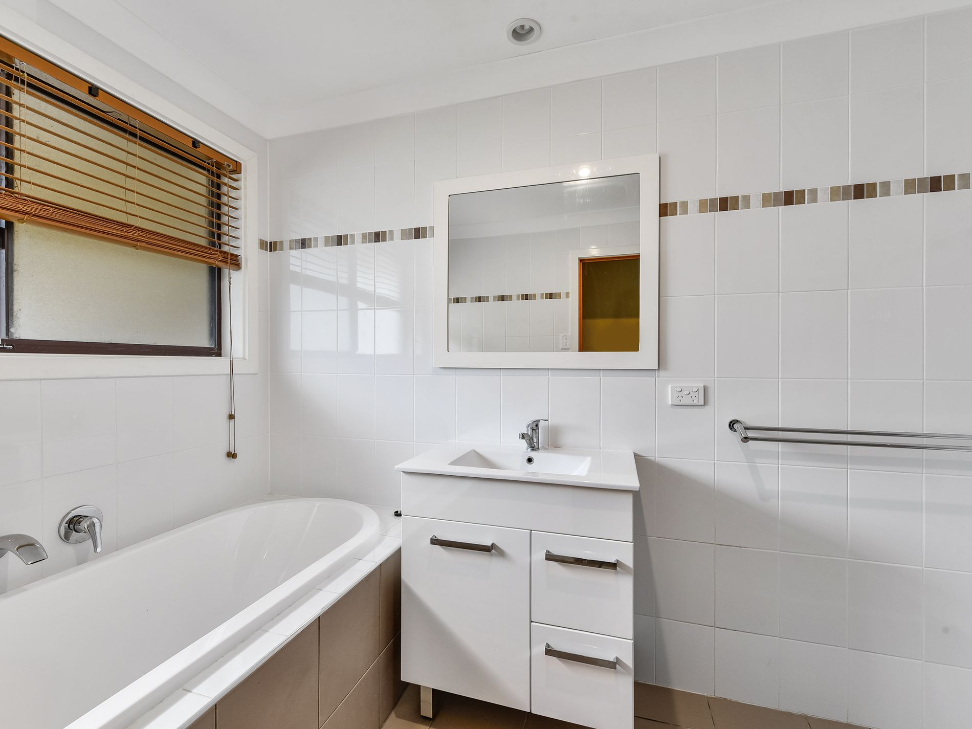 Main bathroom is sleek and a modern design, deep bath, vanity, separate shower and toilet.
