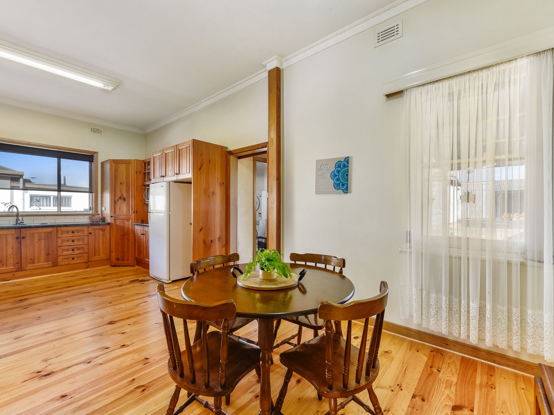 Open the front door and you are in the wide entry hall with beautiful polished timber flooring that also runs through the home.